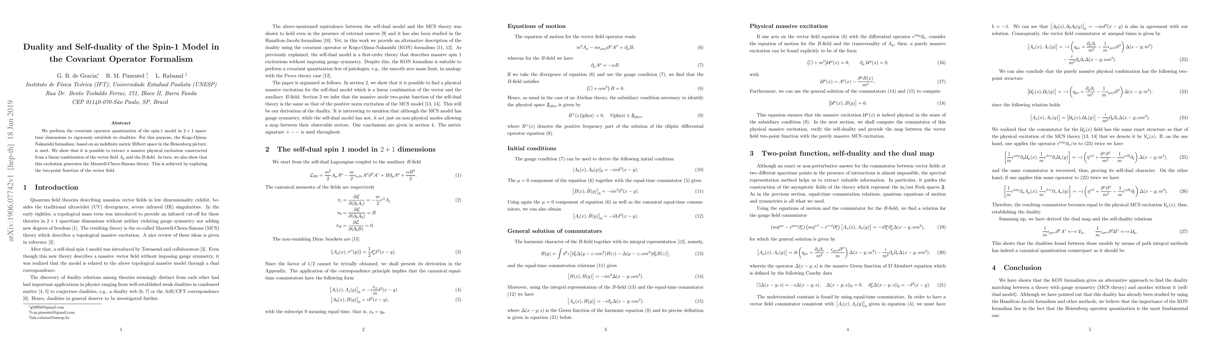 We perform the covariant operator quantization of the spin-$1$ model in $2+1$ spacetime dimensions to rigorously establish its dualities. For this purpose, the Kugo-Ojima-Nakanishi formalism, based on an indefinite metric Hilbert space in the Heisenberg picture, is used. We show that it is possible to extract a massive physical excitation constructed from a linear combination of the vector field $A_{\mu}$ and the $B$-field. In turn, we also show that this excitation generates the Maxwell-Chern-Simons theory. This is achieved by exploring the two-point function of the vector field.