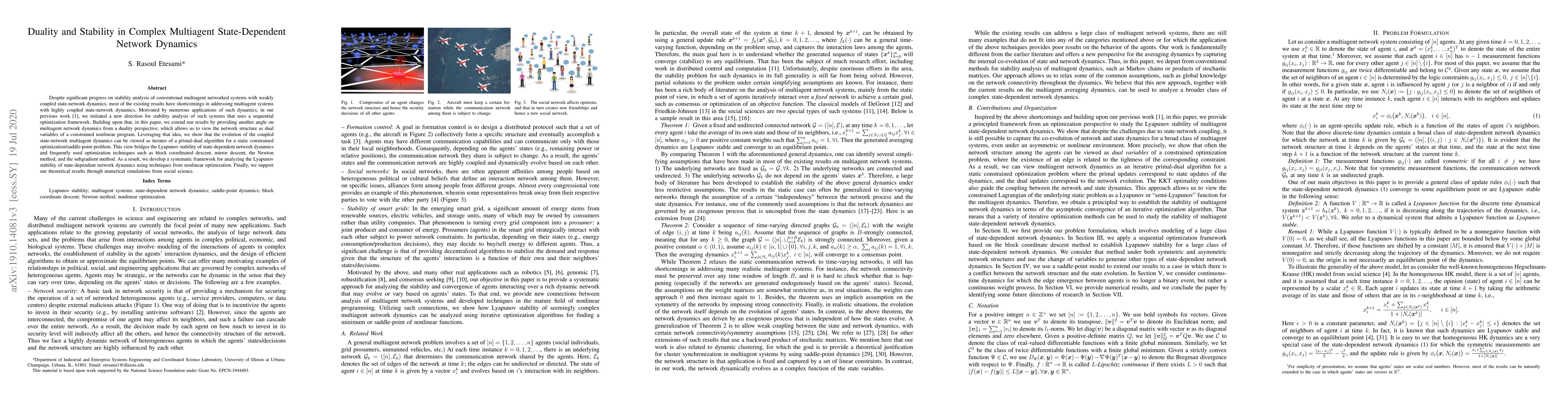This paper extends previous work on stability analysis for highly coupled state-network multiagent systems by introducing a duality perspective. It frames the network dynamics as dual variables in a constrained nonlinear program, linking them to primal-dual optimization algorithms and providing a systematic framework for stability analysis using optimization techniques.