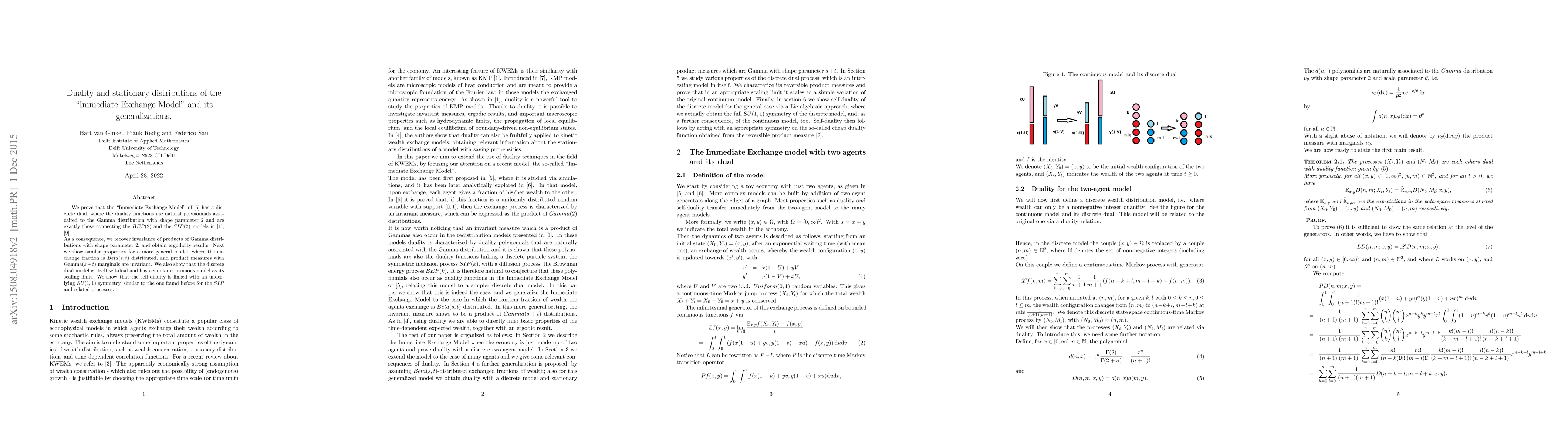 We prove that the "Immediate Exchange Model" of econophysics has a discrete dual, where the duality functions are those connecting the Brownian Energy Process and the Symmetric Inclusion Process. As a consequence, we recover invariance of products of Gamma distributions with shape parameter 2, and obtain ergodicity results. Next we show similar properties of a generalized model, where the exchange fraction is $Beta(s,t)$ distributed (instead of uniform), and product measures with $\mbox{Gamma}(s+t)$ marginals are invariant. We prove that the discrete dual has the self-duality property, and prove full SU(1,1) for both the continuous and discrete model.