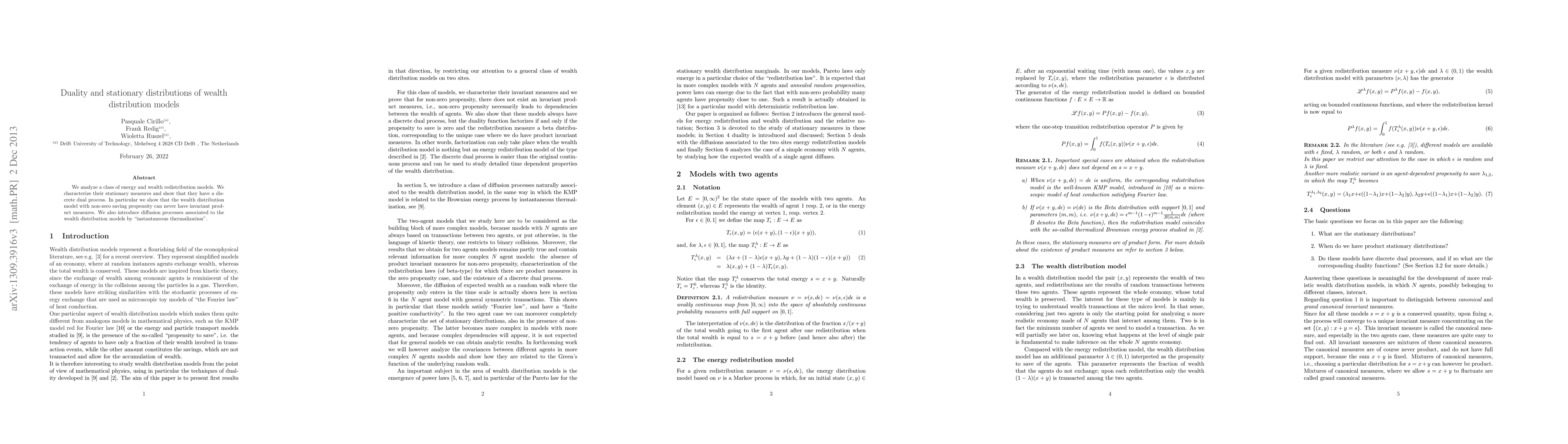 Summary: This paper examines energy and wealth redistribution models, identifying their stationary measures and demonstrating a discrete dual process. It concludes that wealth distribution models with non-zero propensity cannot have invariant product measures, and introduces diffusion processes via "instantaneous thermalization."