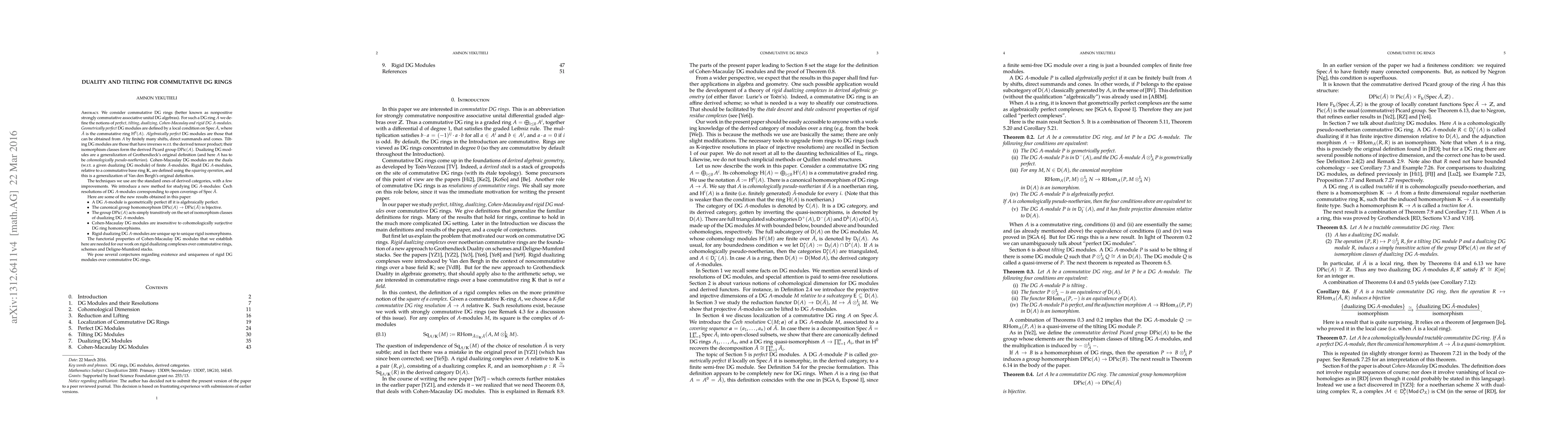 This paper explores commutative DG rings and introduces various DG module categories such as perfect, tilting, dualizing, Cohen-Macaulay, and rigid modules. It uses derived category techniques and Cech resolutions to study these modules and establishes functorial properties, paving the way for further research on rigid dualizing complexes.
