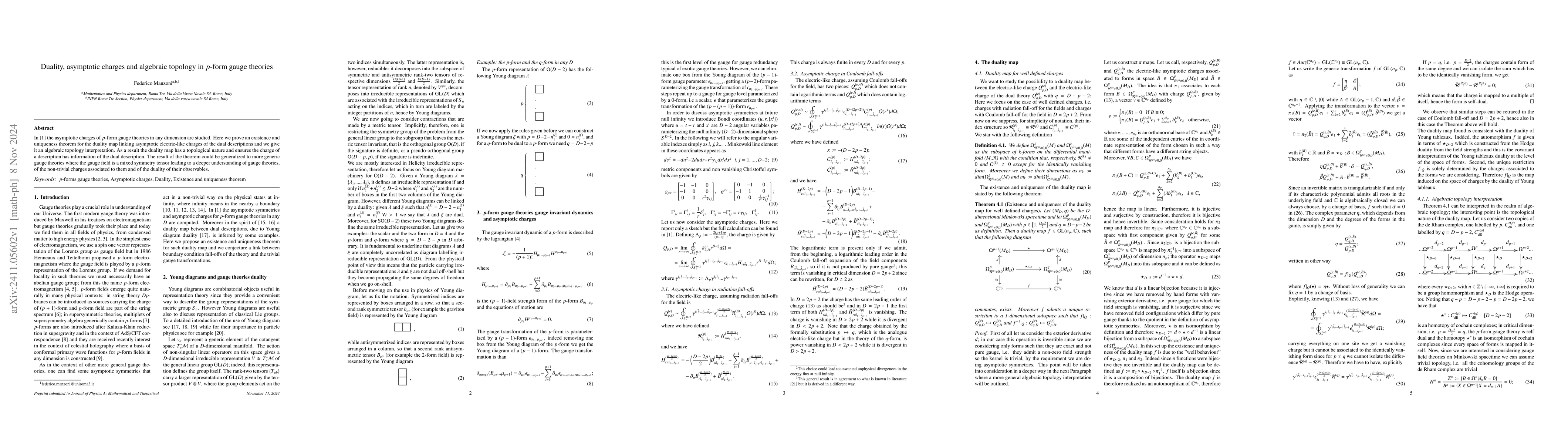 In [1] the asymptotic charges of p-form gauge theories in any dimension are studied. Here we prove an existence and uniqueness theorem for the duality map linking asymptotic electric-like charges of the dual descriptions and we give it an algebraic topology interpretation. As a result the duality map has a topological nature and ensures the charge of a description has information of the dual description. The result of the theorem could be generalized to more generic gauge theories where the gauge field is a mixed symmetry tensor leading to a deeper understanding of gauge theories, of the non-trivial charges associated to them and of the duality of their observable.