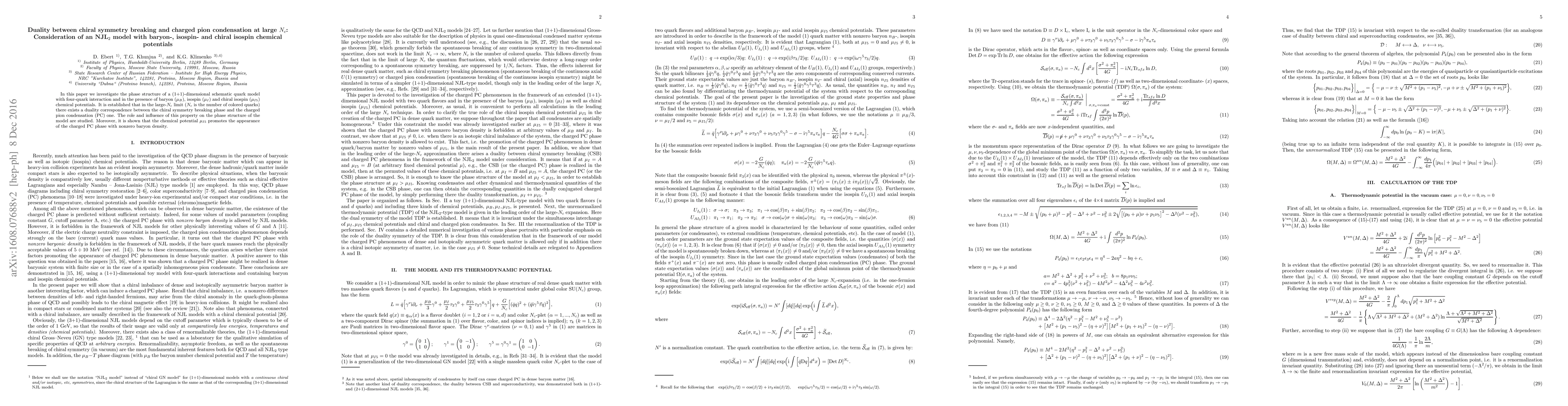 This paper explores the phase structure of a (1+1)-dimensional NJL$_2$ model with baryon, isospin, and chiral isospin chemical potentials, revealing a duality between chiral symmetry breaking and charged pion condensation in the large-$N_c$ limit. The study highlights the role of chiral isospin chemical potential in inducing charged pion condensation with nonzero baryon density.