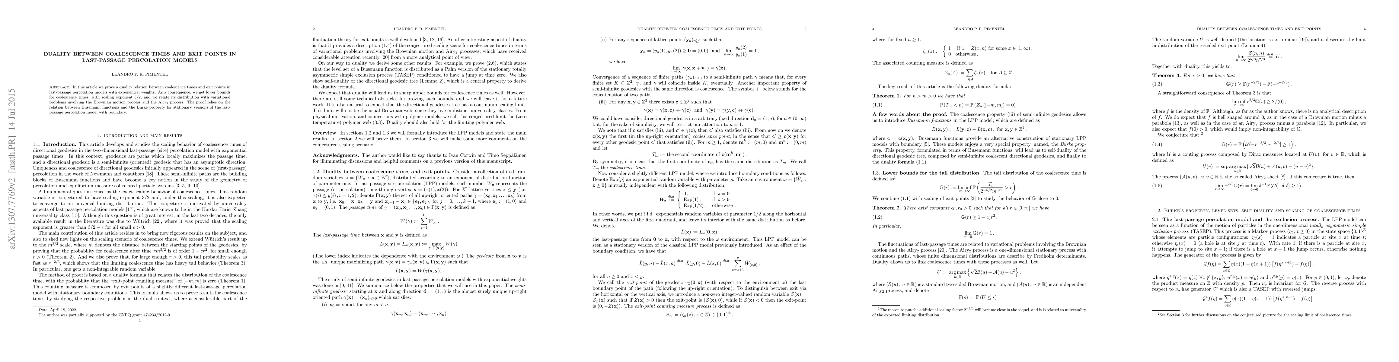 This paper establishes a duality between coalescence times and exit points in last-passage percolation models with exponential weights, leading to lower bounds for coalescence times with a scaling exponent of 3/2 and linking their distribution to variational problems involving Brownian motion and the Airy process.