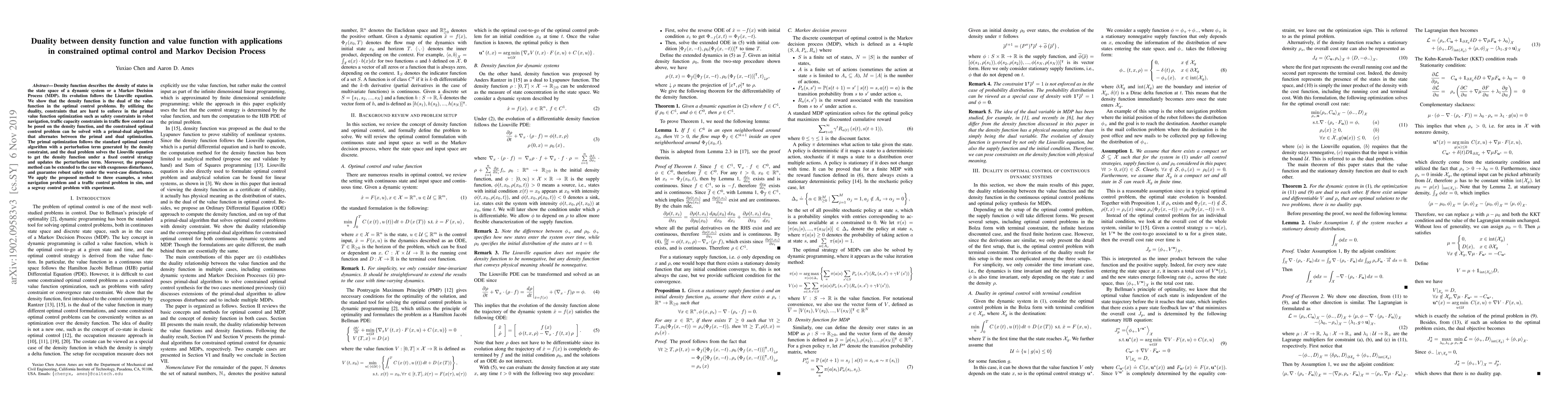 This research paper shows that a density function, which describes state space, is the dual of a value function in optimal control problems, enabling the use of constraints like safety or traffic capacity to be posed on the density function, allowing for more effective solution methods.