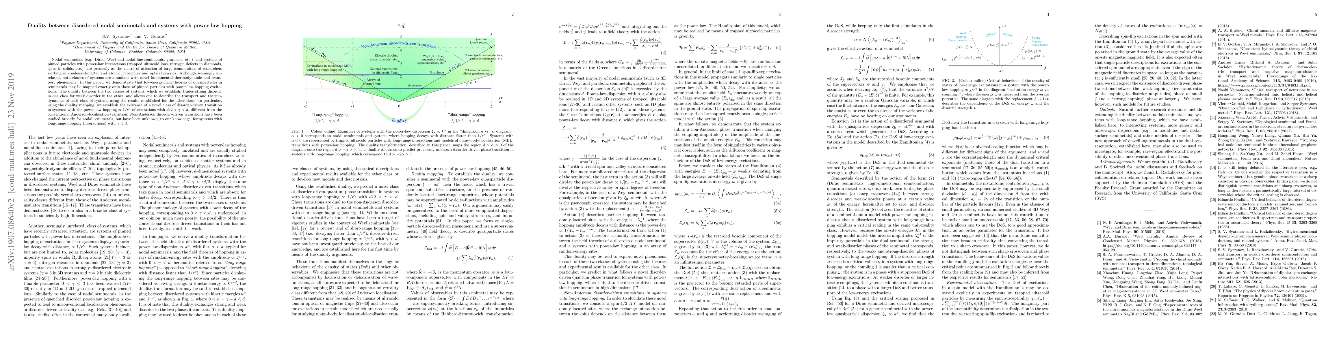 This paper establishes a duality between disordered nodal semimetals and systems with power-law hopping, demonstrating that their low-energy field theories are exactly equivalent. This allows for the description of transport and thermodynamics in one class using results from the other, revealing a novel class of disorder-driven transitions in systems with non-Anderson localization.