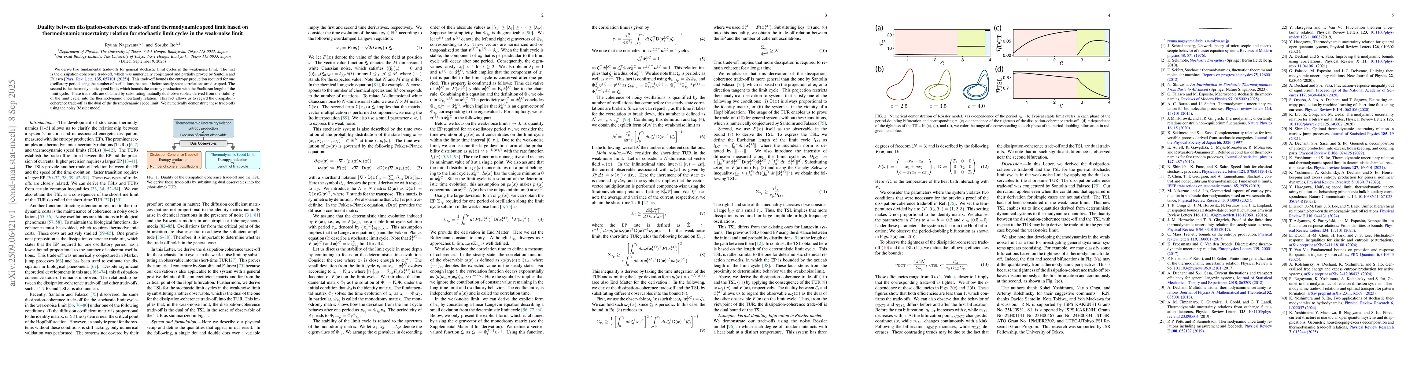 We derive two fundamental trade-offs for general stochastic limit cycles in the weak-noise limit. The first is the dissipation-coherence trade-off, which was numerically conjectured and partially proved by Santolin and Falasco [Phys. Rev. Lett. 135, 057101 (2025)]. This trade-off bounds the entropy production required for one oscillatory period using the number of oscillations that occur before steady-state correlations are disrupted. The second is the thermodynamic speed limit, which bounds the entropy production with the Euclidean length of the limit cycle. These trade-offs are obtained by substituting mutually dual observables, derived from the stability of the limit cycle, into the thermodynamic uncertainty relation. This fact allows us to regard the dissipation-coherence trade-off as the dual of the thermodynamic speed limit. We numerically demonstrate these trade-offs using the noisy R\"{o}ssler model.