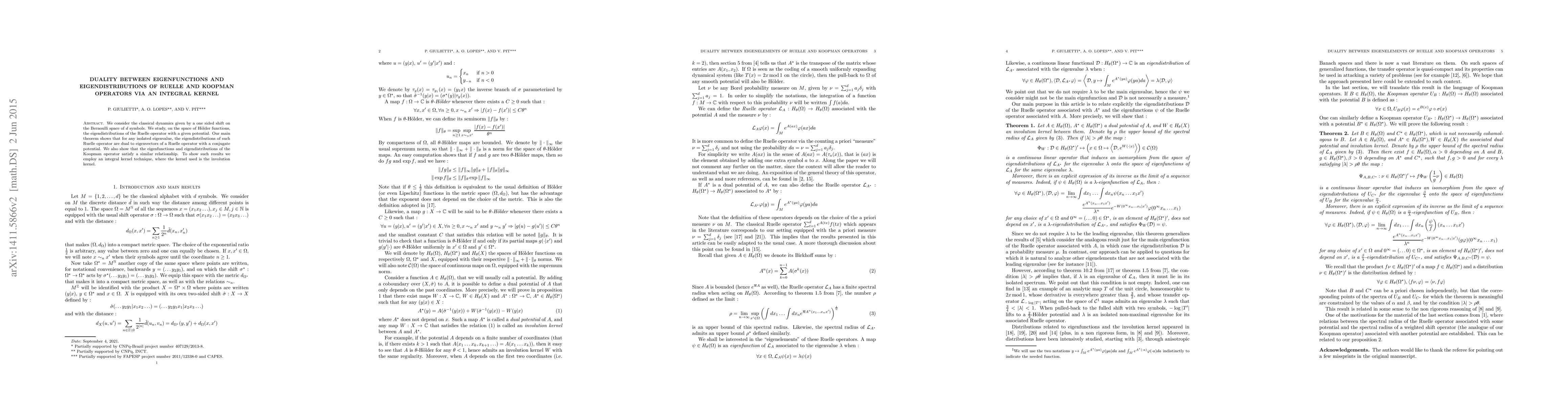 This paper explores the dynamics of a one-sided shift on the Bernoulli space, focusing on the eigendistributions of the Ruelle operator. It establishes a duality between eigendistributions and eigenfunctions via an integral kernel, showing similar relationships for the Koopman operator.
