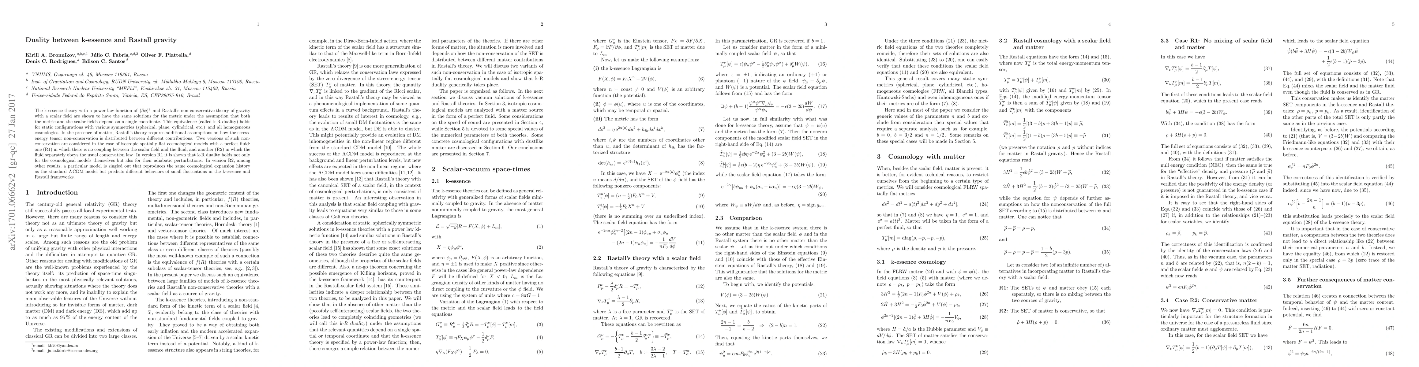 This paper demonstrates the equivalence (k-R duality) between k-essence and Rastall gravity theories under specific conditions, showing identical metric solutions for static configurations and homogeneous cosmologies. It also explores two versions of Rastall theory's non-conservation, revealing distinct behaviors in cosmological models and their perturbations.