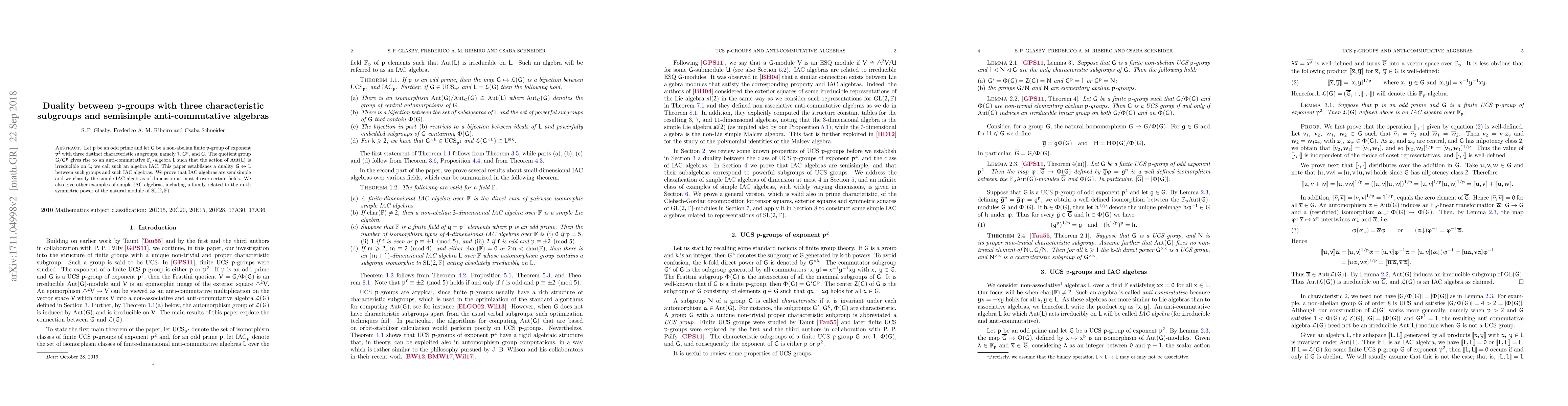 Let $p$ be an odd prime and let $G$ be a non-abelian finite $p$-group of exponent $p^2$ with three distinct characteristic subgroups, namely $1$, $G^p$, and $G$. The quotient group $G/G^p$ gives rise to an anti-commutative ${\mathbb F}_p$-algebra $L$ such that the action of ${\rm Aut}(L)$ is irreducible on $L$; we call such an algebra IAC. This paper establishes a duality $G\leftrightarrow L$ between such groups and such IAC algebras. We prove that IAC algebras are semisimple and we classify the simple IAC algebras of dimension at most 4 over certain fields. We also give other examples of simple IAC algebras, including a family related to the $m$-th symmetric power of the natural module of ${\rm SL}(2,{\mathbb F})$.