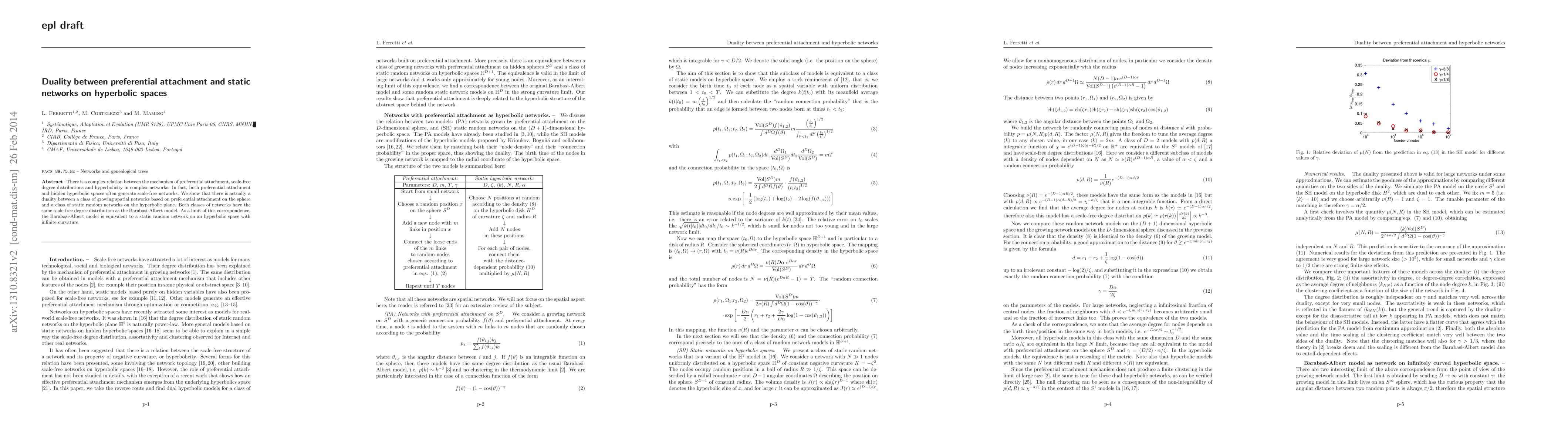 This paper explores the duality between growing networks with preferential attachment on a sphere and static random networks on a hyperbolic plane, demonstrating they both yield scale-free degree distributions similar to the Barabasi-Albert model, with the latter equivalent to the former in the limit of infinite curvature.