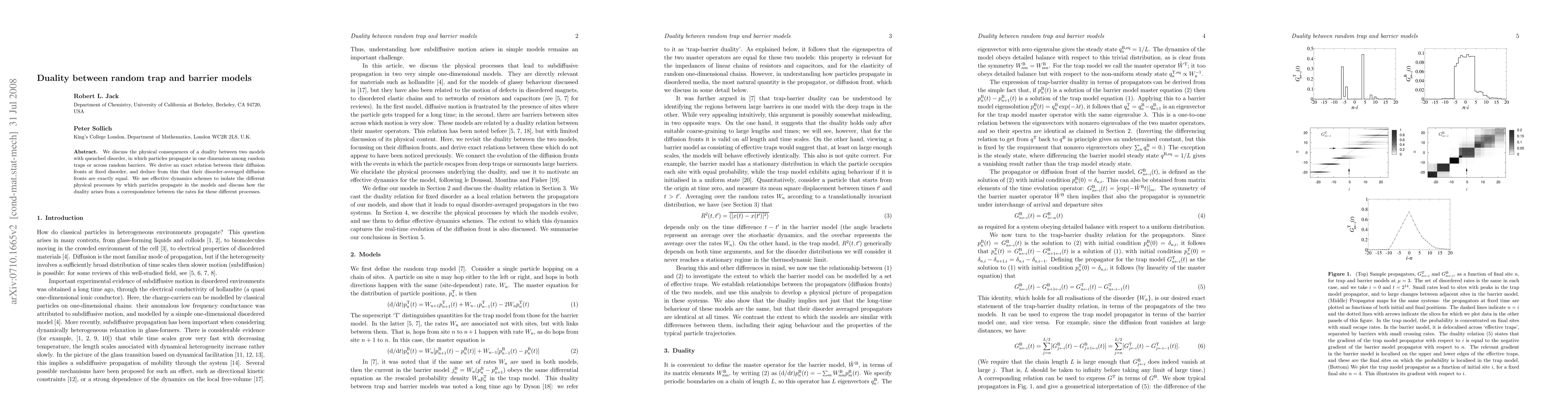 We discuss the physical consequences of a duality between two models with quenched disorder, in which particles propagate in one dimension among random traps or across random barriers. We derive an exact relation between their diffusion fronts at fixed disorder, and deduce from this that their disorder-averaged diffusion fronts are exactly equal. We use effective dynamics schemes to isolate the different physical processes by which particles propagate in the models and discuss how the duality arises from a correspondence between the rates for these different processes.
