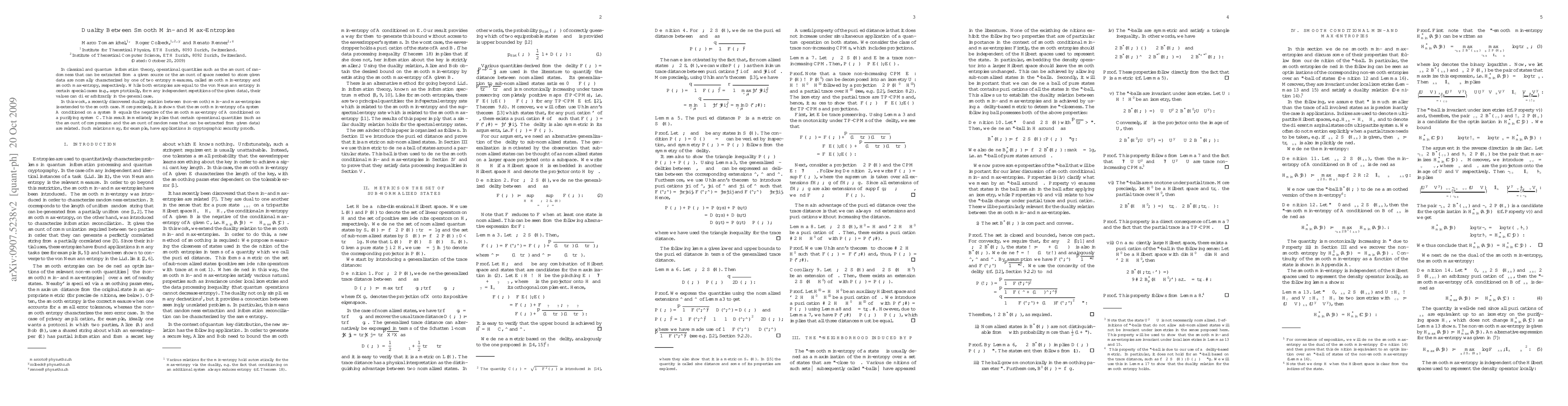 This paper extends the duality between min- and max-entropies to the smooth case, showing that the smooth min-entropy of system A conditioned on B equals the negative of the smooth max-entropy of A conditioned on a purifying system C. This duality reveals operational connections between compression and randomness extraction, potentially enhancing cryptographic security proofs.
