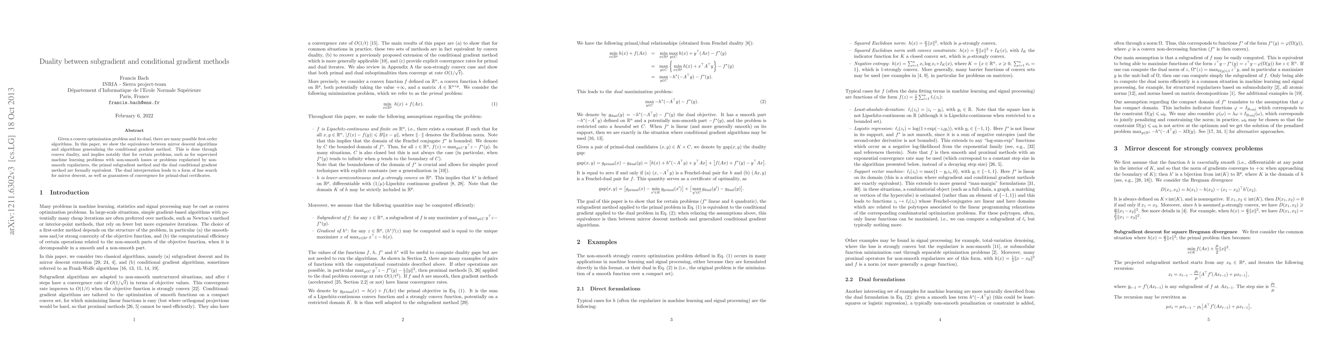 Given a convex optimization problem and its dual, there are many possible first-order algorithms. In this paper, we show the equivalence between mirror descent algorithms and algorithms generalizing the conditional gradient method. This is done through convex duality, and implies notably that for certain problems, such as for supervised machine learning problems with non-smooth losses or problems regularized by non-smooth regularizers, the primal subgradient method and the dual conditional gradient method are formally equivalent. The dual interpretation leads to a form of line search for mirror descent, as well as guarantees of convergence for primal-dual certificates.