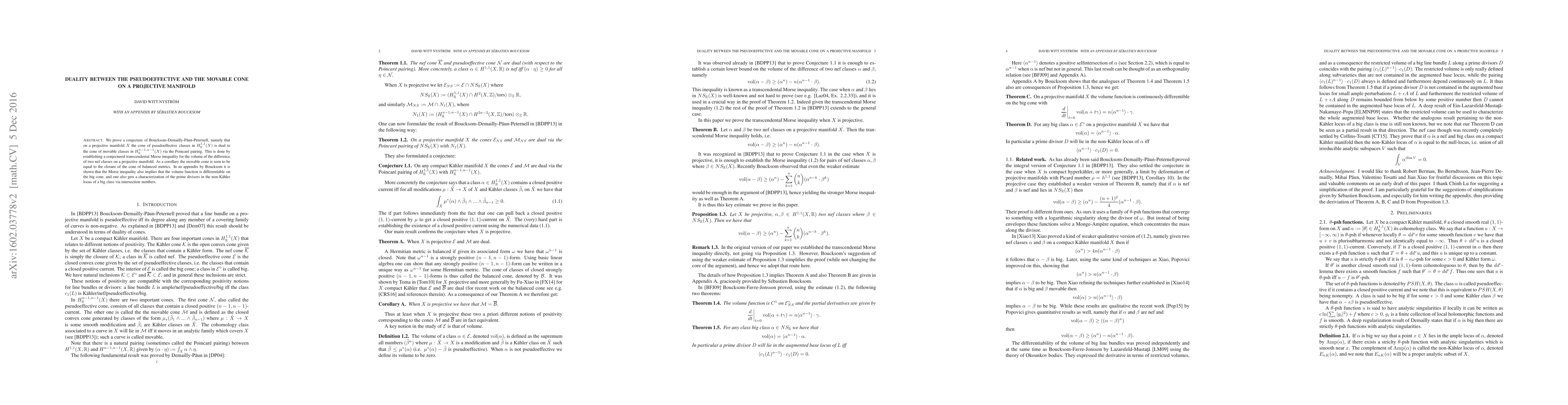We prove a conjecture of Boucksom-Demailly-P\u{a}un-Peternell, namely that on a projective manifold $X$ the cone of pseudoeffective classes in $H^{1,1}_{\mathbb{R}}(X)$ is dual to the cone of movable classes in $H^{n-1,n-1}_{\mathbb{R}}(X)$ via the Poincar\'e pairing. This is done by establishing a conjectured transcendental Morse inequality for the volume of the difference of two nef classes on a projective manifold. As a corollary the movable cone is seen to be equal to the closure of the cone of balanced metrics. In an appendix by Boucksom it is shown that the Morse inequality also implies that the volume function is differentiable on the big cone, and one also gets a characterization of the prime divisors in the non-K\"ahler locus of a big class via intersection numbers.