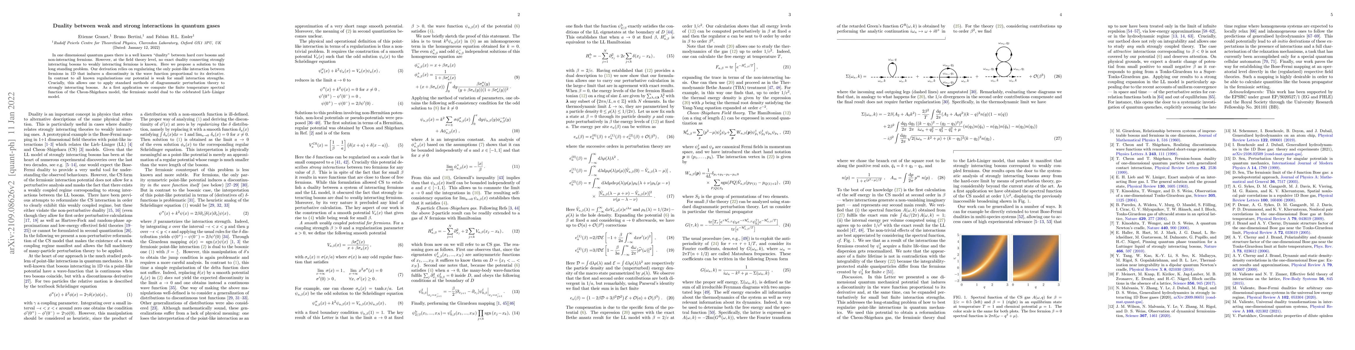 In one dimensional quantum gases there is a well known "duality" between hard core bosons and non-interacting fermions. However, at the field theory level, no exact duality connecting strongly interacting bosons to weakly interacting fermions is known. Here we propose a solution to this long standing problem. Our derivation relies on regularizing the only point-like interaction between fermions in 1D that induces a discontinuity in the wave function proportional to its derivative. In contrast to all known regularisations our potential is weak for small interaction strengths. Crucially, this allows one to apply standard methods of diagrammatic perturbation theory to strongly interacting bosons. As a first application we compute the finite temperature spectral function of the Cheon-Shigehara model, the fermionic model dual to the celebrated Lieb-Liniger model.