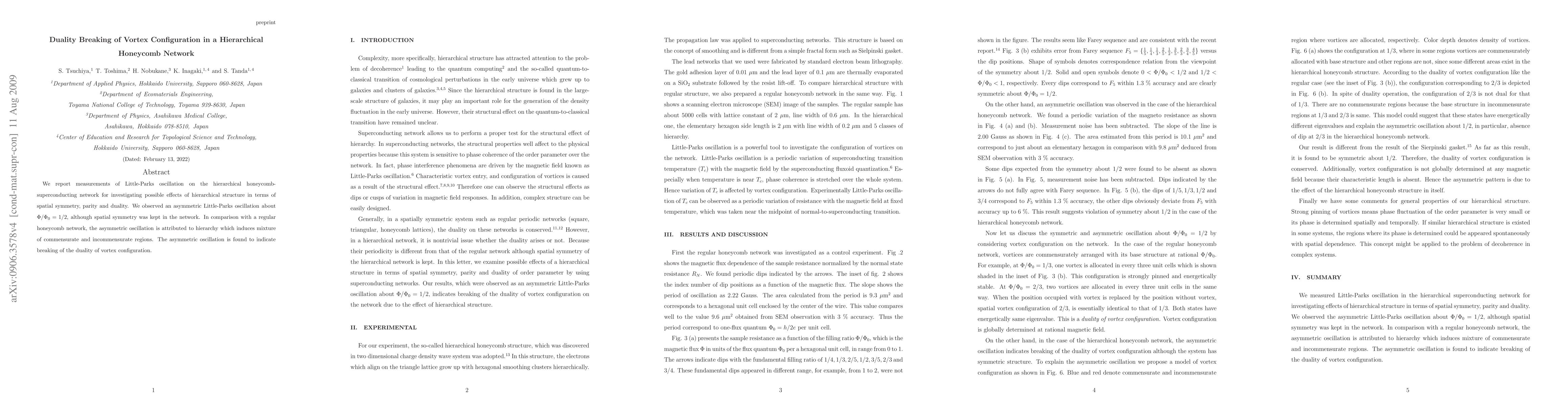 We report measurements of Little-Parks oscillation on the hierarchical honeycomb-superconducting network for investigating possible effects of hierarchical structure in terms of spatial symmetry, parity and duality. We observed an asymmetric Little-Parks oscillation about $\Phi/\Phi_0 = 1/2$, although spatial symmetry was kept in the network. In comparison with a regular honeycomb network, the asymmetric oscillation is attributed to hierarchy which induces mixture of commensurate and incommensurate regions. The asymmetric oscillation is found to indicate breaking of the duality of vortex configuration.