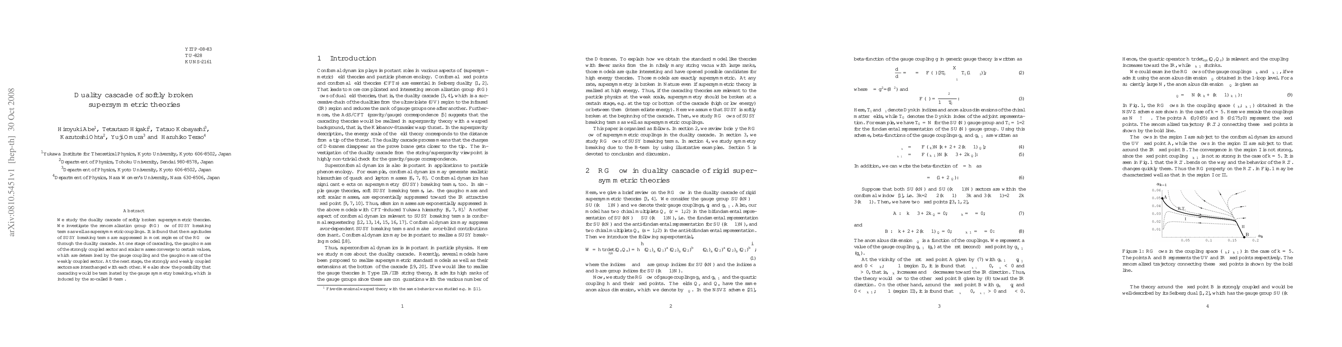 This paper explores the renormalization group flow in softly broken supersymmetric theories, revealing that SUSY breaking terms diminish through a duality cascade. The study finds that gaugino and scalar masses converge at a certain stage, determined by gauge coupling and weakly coupled sector's gaugino mass, followed by sector interchange and potential termination via gauge symmetry breaking induced by B-terms.
