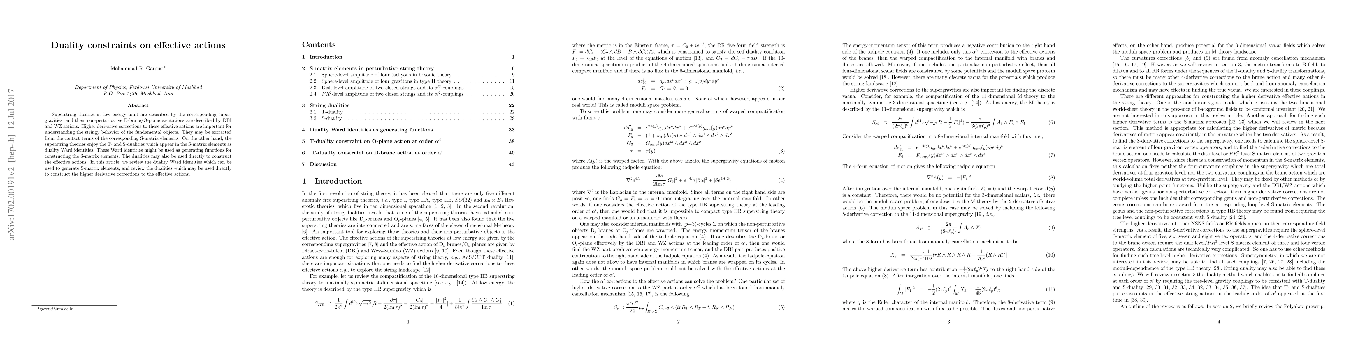 Superstring theories at low energy limit are described by the corresponding supergravities, and their non-perturbative D-brane/O-plane excitations are described by DBI and WZ actions. Higher derivative corrections to these effective actions are important for understanding the stringy behavior of the fundamental objects. They may be extracted from the contact terms of the corresponding S-matrix elements. On the other hand, the superstring theories enjoy the T- and S-dualities which appear in the S-matrix elements as duality Ward identities. These Ward identities might be used as generating functions for constructing the S-matrix elements. The dualities may also be used directly to construct the effective actions. In this article, we review the duality Ward identities which can be used to generate S-matrix elements, and review the dualities which may be used directly to construct the higher derivative corrections to the effective actions.