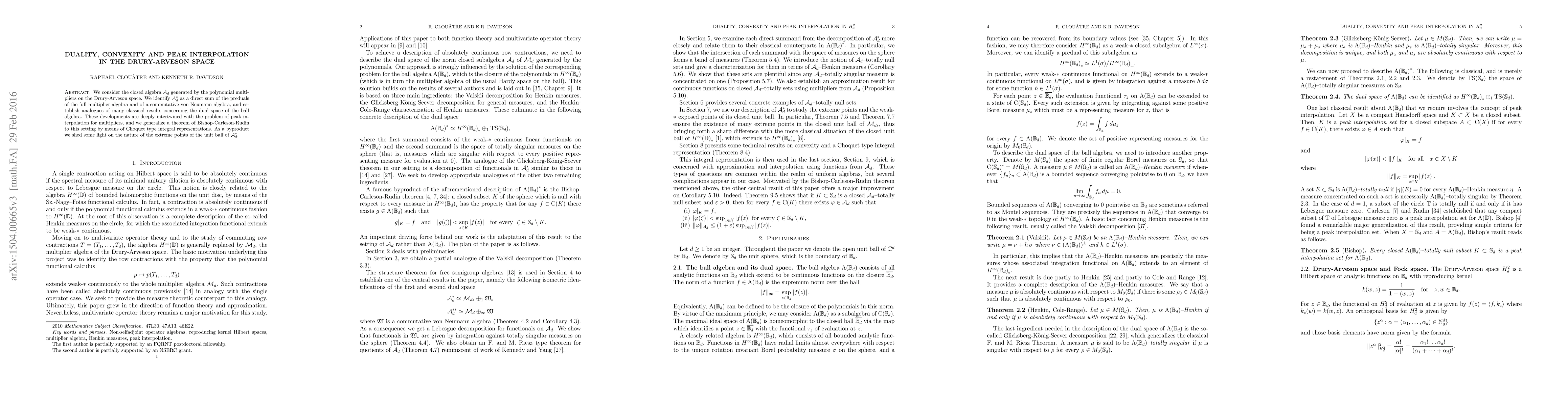 This paper explores the duality and convexity properties of the closed algebra $\mathcal{A}_d$ in the Drury-Arveson space, identifying its dual as a sum of preduals and establishing peak interpolation results, extending classical theorems via Choquet type integral representations. It also investigates the extreme points of the unit ball in $\mathcal{A}^*_d$.