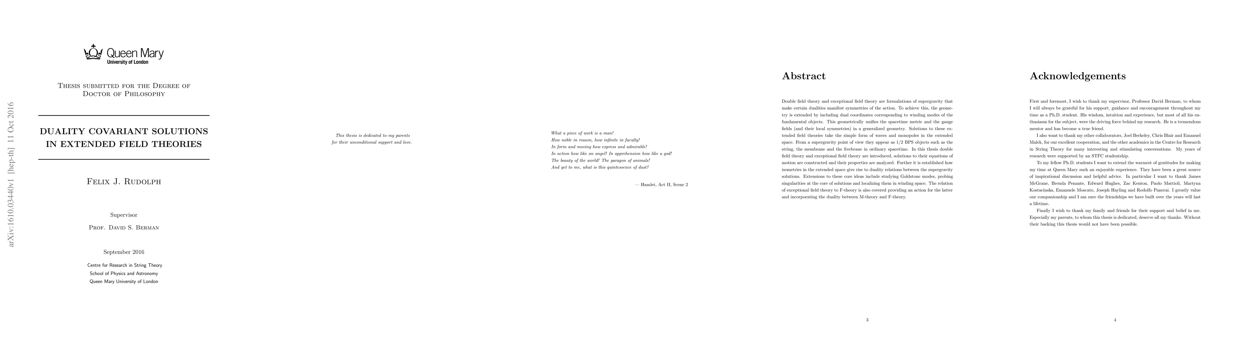 This paper explores double field theory and exceptional field theory, revealing how extended geometries unify spacetime metric and gauge fields. It constructs solutions manifesting as 1/2 BPS objects in supergravity, and analyzes the duality relations arising from isometries in the extended space.