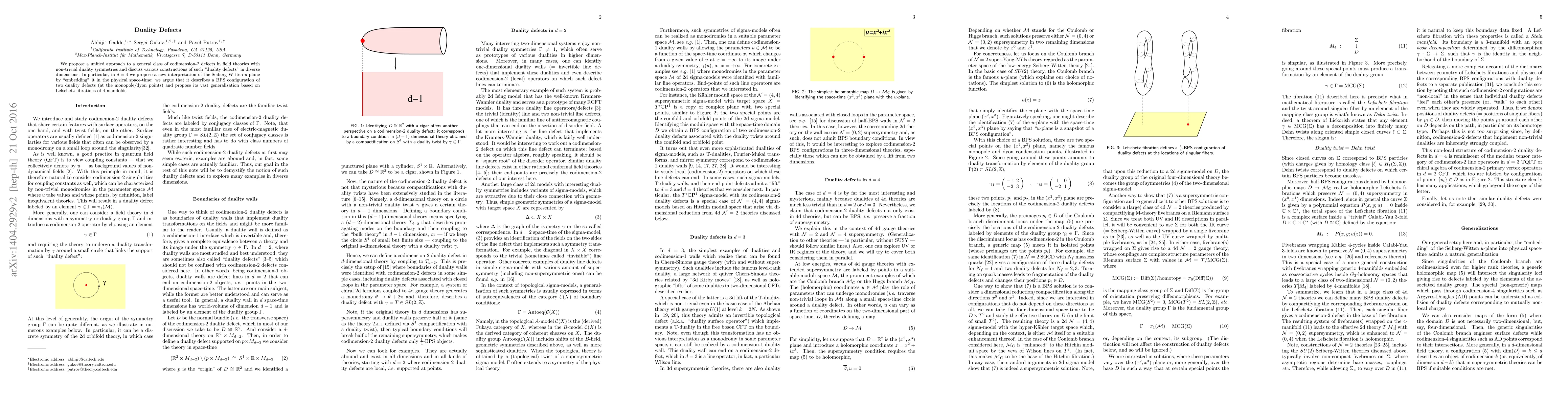 The paper proposes a unified approach to codimension-2 defects in field theories with non-trivial duality symmetries, discussing various constructions across diverse dimensions, including a new interpretation of the Seiberg-Witten u-plane in d=4 as a BPS configuration of duality defects based on Lefschetz fibrations of 4-manifolds.