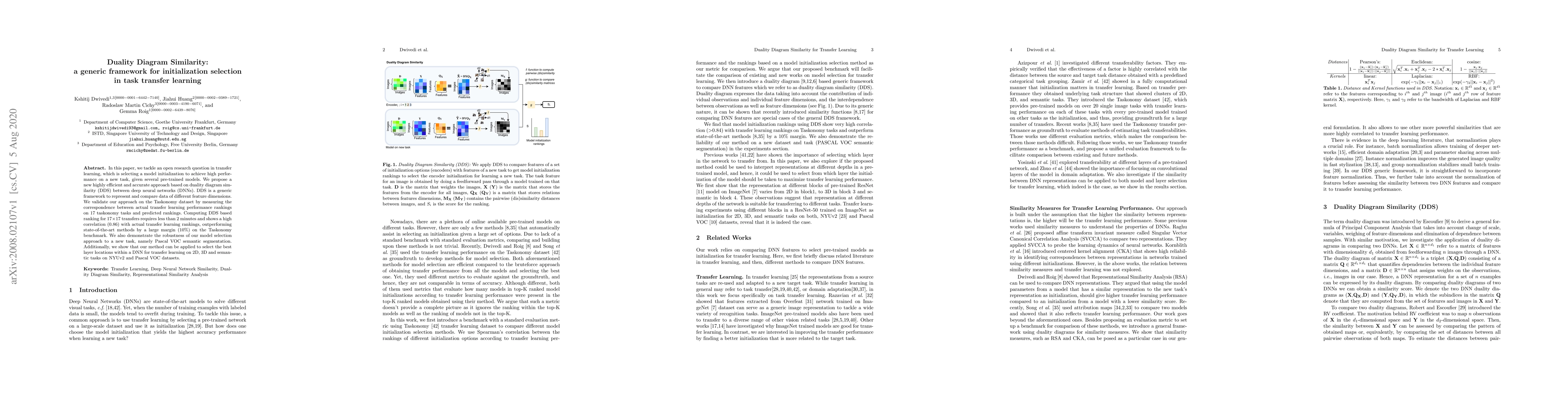 In this paper, we tackle an open research question in transfer learning, which is selecting a model initialization to achieve high performance on a new task, given several pre-trained models. We propose a new highly efficient and accurate approach based on duality diagram similarity (DDS) between deep neural networks (DNNs). DDS is a generic framework to represent and compare data of different feature dimensions. We validate our approach on the Taskonomy dataset by measuring the correspondence between actual transfer learning performance rankings on 17 taskonomy tasks and predicted rankings. Computing DDS based ranking for $17\times17$ transfers requires less than 2 minutes and shows a high correlation ($0.86$) with actual transfer learning rankings, outperforming state-of-the-art methods by a large margin ($10\%$) on the Taskonomy benchmark. We also demonstrate the robustness of our model selection approach to a new task, namely Pascal VOC semantic segmentation. Additionally, we show that our method can be applied to select the best layer locations within a DNN for transfer learning on 2D, 3D and semantic tasks on NYUv2 and Pascal VOC datasets.