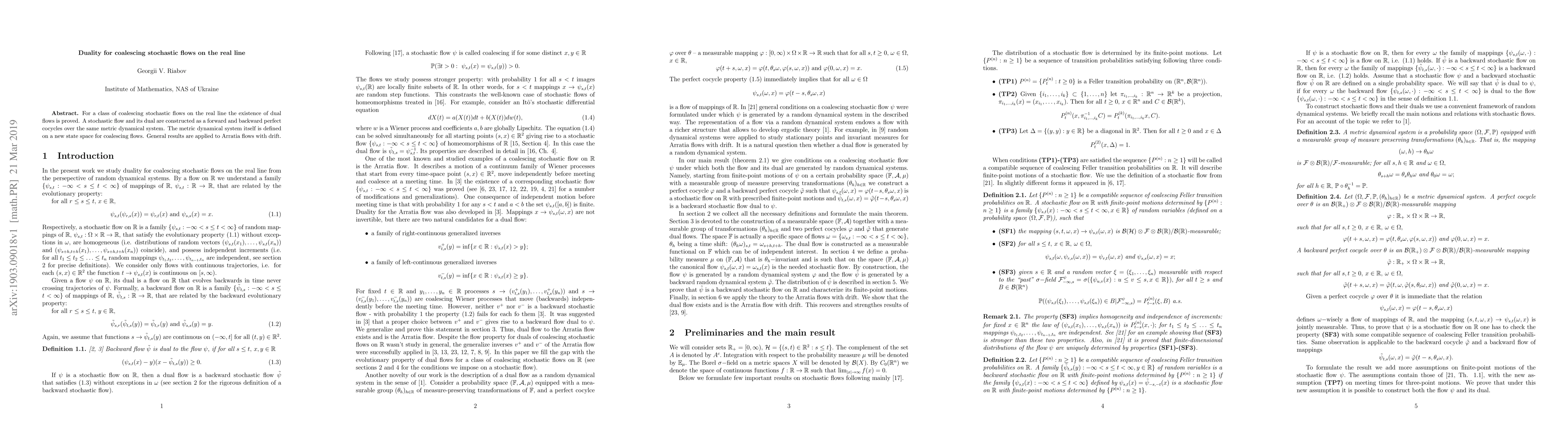This paper proves the existence of dual flows for a class of coalescing stochastic flows on the real line, constructing both forward and backward perfect cocycles over a new state space metric dynamical system. It applies these general results to Arratia flows with drift.
