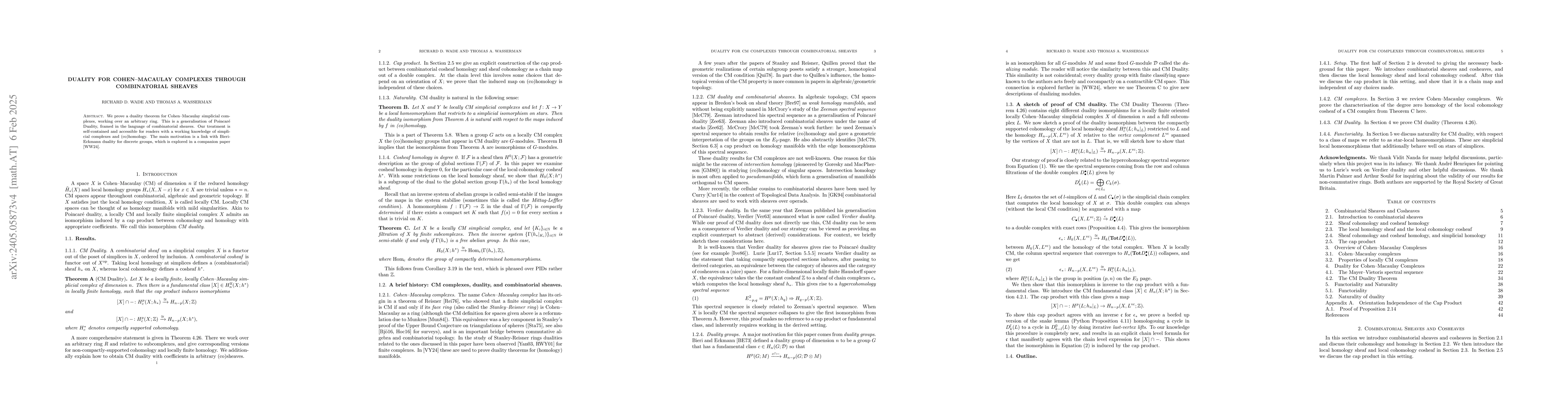The paper establishes a duality theorem for Cohen--Macaulay simplicial complexes, generalizing Poincaré Duality via combinatorial sheaves. The work is self-contained and aims to connect with Bieri-Eckmann duality for discrete groups, further discussed in a related study.