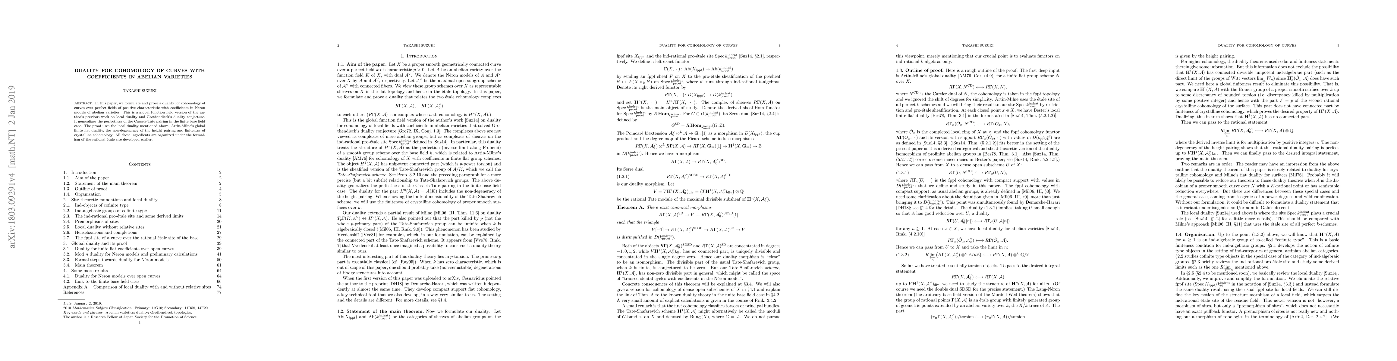 This paper establishes a duality for the cohomology of curves over perfect fields in positive characteristic with coefficients in Neron models of abelian varieties, extending previous work on local duality and Grothendieck's duality conjecture. The proof leverages local duality, global finite flat duality, the height pairing, and crystalline cohomology within the rational etale site framework.