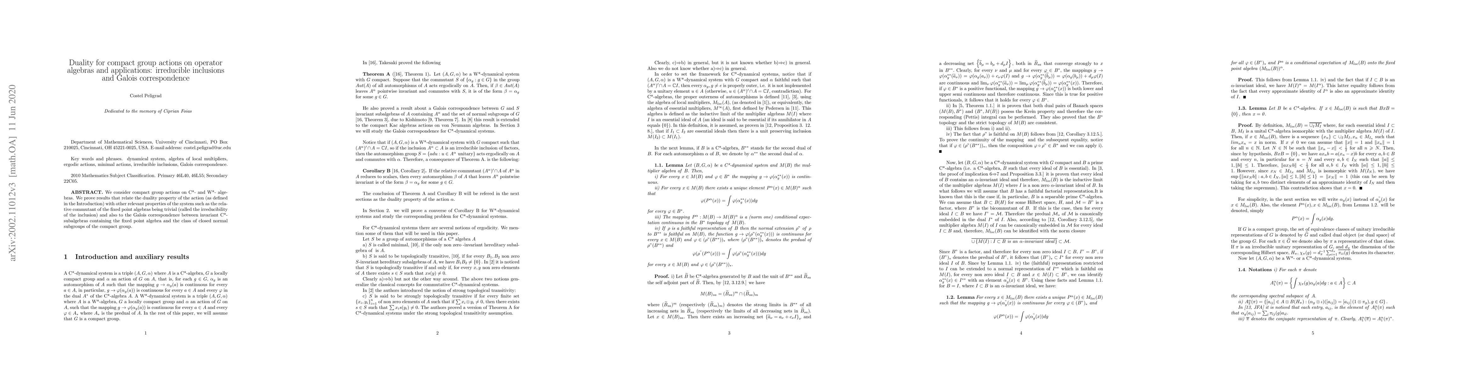 We consider compact group actions on C*- and W*- algebras. We prove results that relate the duality property of the action (as defined in the Introduction) with other relevant properties of the system such as the relative commutant of the fixed point algebras being trivial (called the irreducibility of the inclusion) and also to the Galois correspondence between invariant C*-subalgebras containing the fixed point algebra and the class of closed normal subgroups of the compact group.