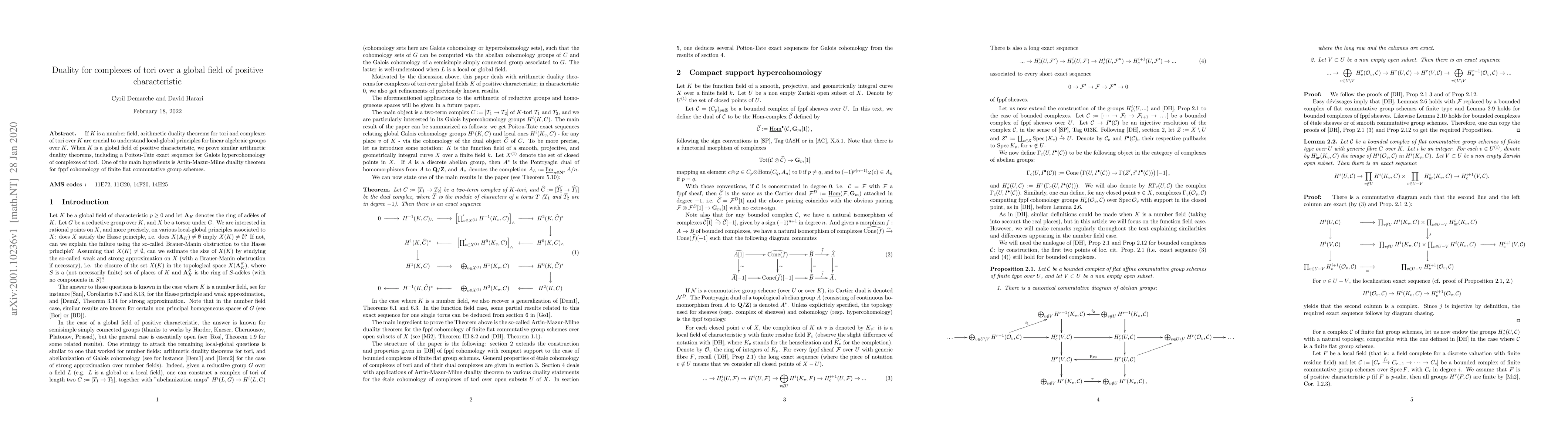 Summary: The paper establishes arithmetic duality theorems for tori and complexes of tori over global fields of positive characteristic, including a Poitou-Tate exact sequence for Galois hypercohomology, utilizing the Artin-Mazur-Milne duality theorem for fppf cohomology.