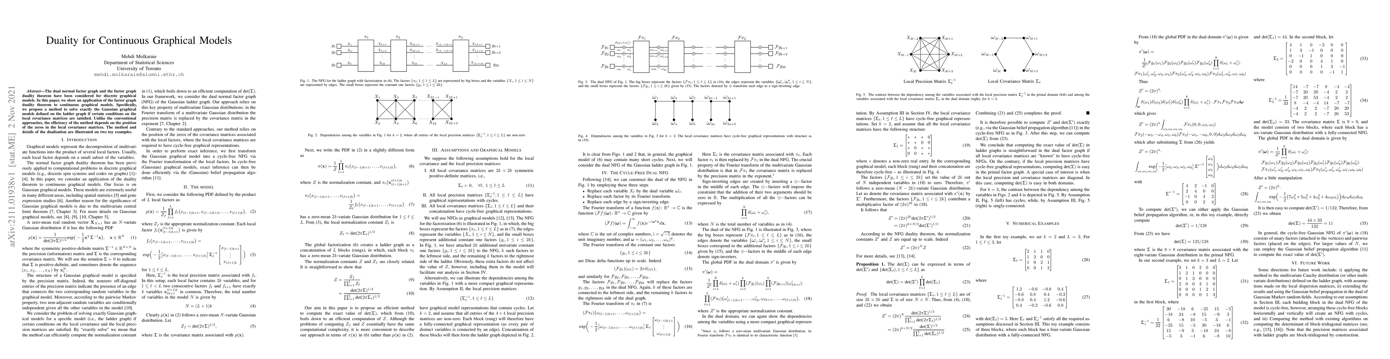 This paper extends the factor graph duality theorem to continuous graphical models, specifically for Gaussian graphical models on ladder graphs, under certain conditions on the local covariance matrices. The proposed method leverages the positions of zeros in these matrices for efficiency, illustrated through two toy examples.