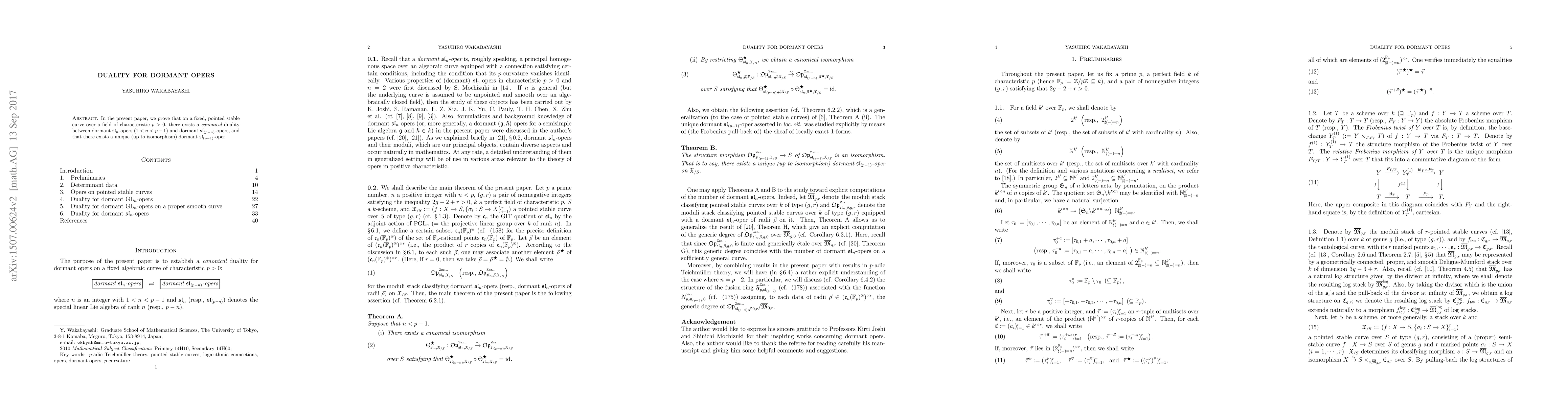 This paper establishes a duality between dormant $\mathfrak{sl}_n$-opers and dormant $\mathfrak{sl}_{(p-n)}$-opers on fixed pointed stable curves of characteristic $p>0$, and demonstrates the uniqueness (up to isomorphism) of dormant $\mathfrak{sl}_{(p-1)}$-opers under the same conditions.