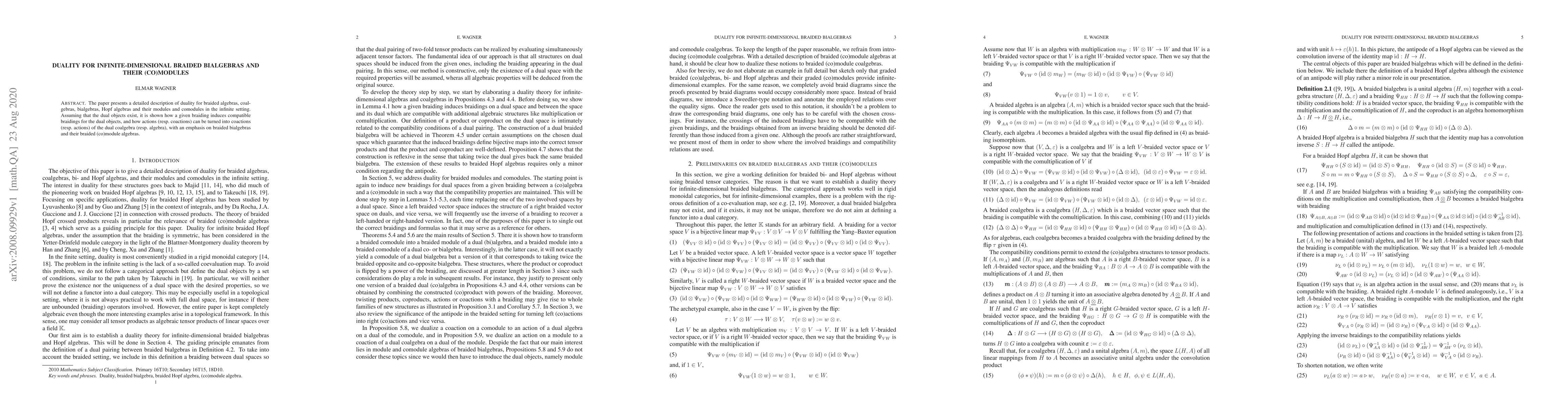 The paper explores duality in the context of infinite-dimensional braided bialgebras and their (co)modules, demonstrating how braidings induce compatible structures in dual objects, and how actions and coactions transform accordingly in the dual setting, with a focus on braided bialgebras and their associated (co)module algebras.
