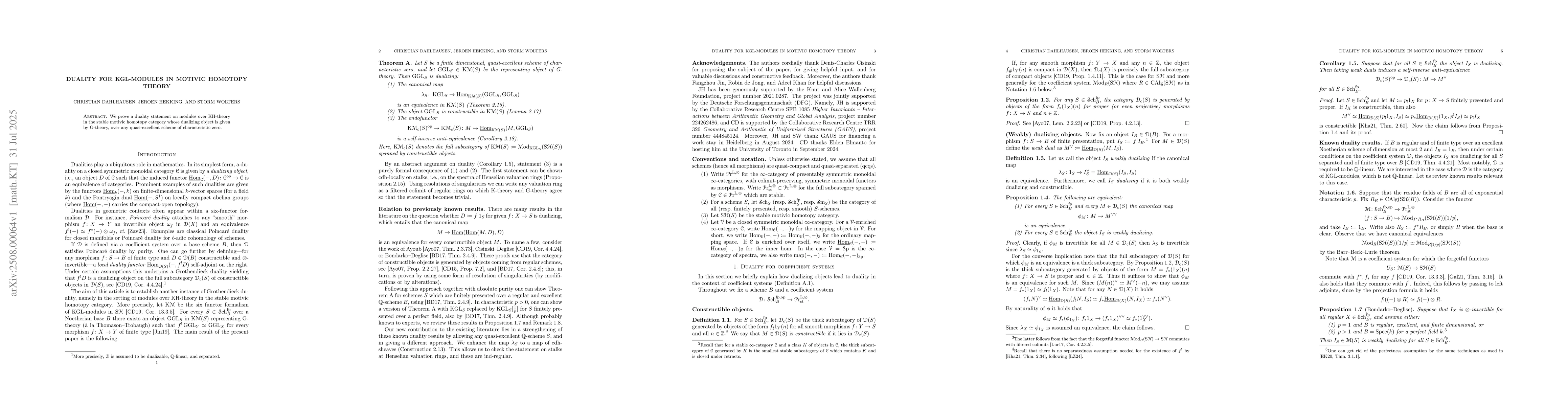 We prove a duality statement on modules over KH-theory in the stable motivic homotopy category whose dualizing object is given by G-theory, over any quasi-excellent scheme of characteristic zero.