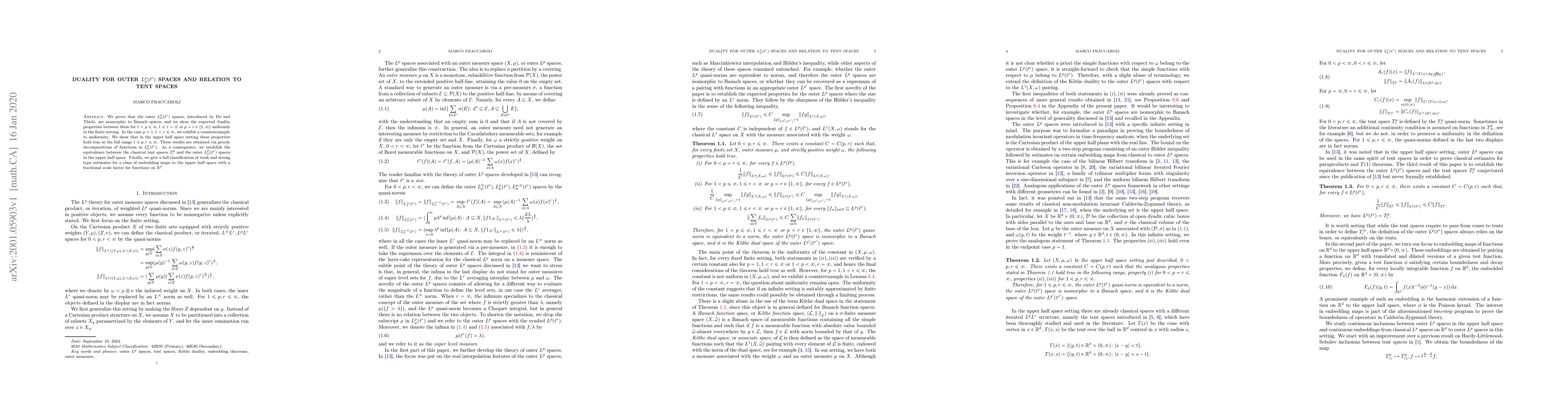 The research paper establishes isomorphism between outer $L^p_ u( ho)$ spaces and Banach spaces, with specific duality properties for certain ranges of $p$ and $ ho$, including equivalence to tent spaces in the upper half space setting.