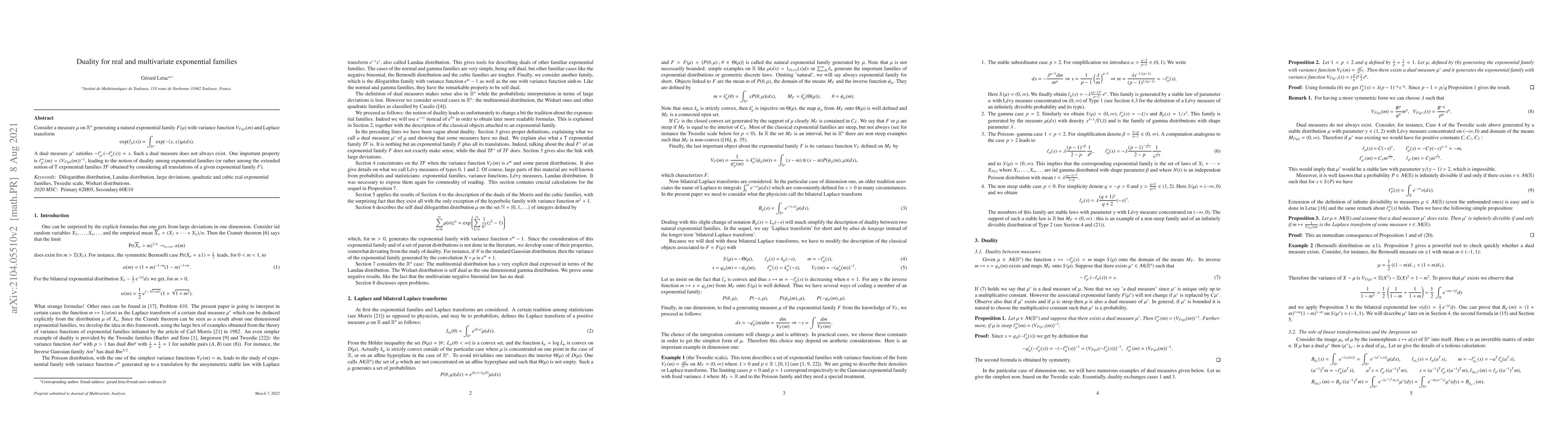 This paper explores the existence and properties of dual measures for real and multivariate exponential families, establishing a relationship between the dual measure's Laplace transform and the variance function of the original family, and introducing the concept of duality within extended exponential families.