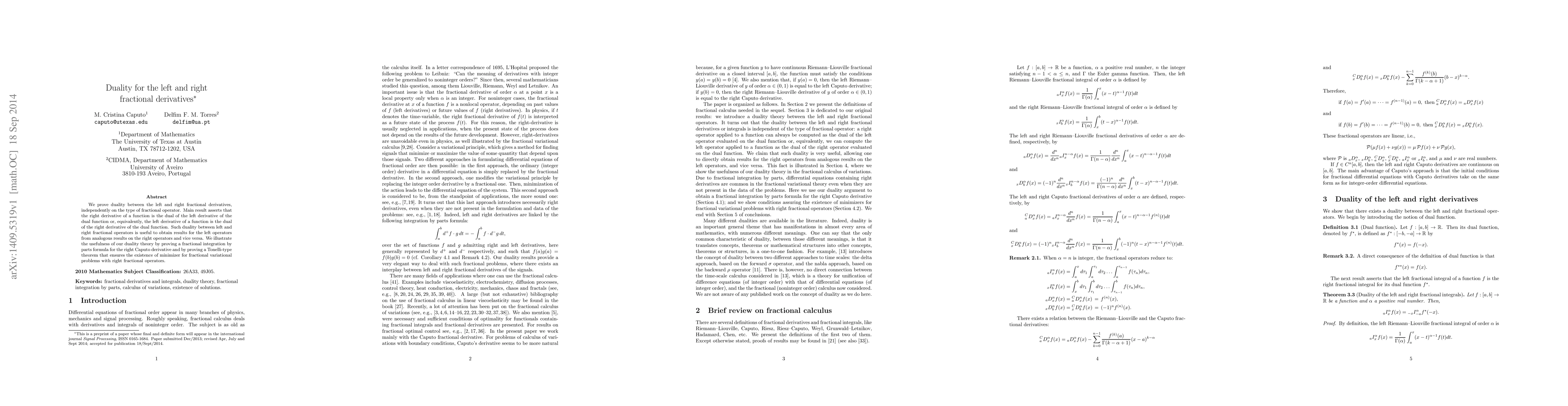 This paper establishes a duality between left and right fractional derivatives, demonstrating that the right derivative of a function is the dual of the left derivative of its dual, and vice versa. This duality facilitates transferring results between left and right fractional operators, exemplified by a new fractional integration by parts formula for the right Caputo derivative and a Tonelli-type theorem for fractional variational problems.
