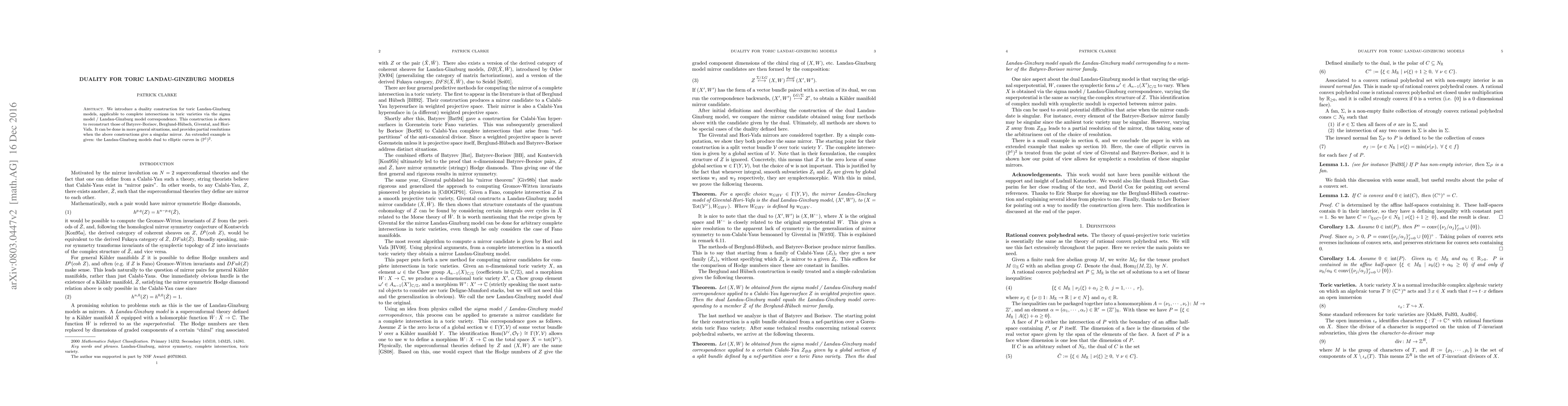 The paper introduces a new duality construction for toric Landau-Ginzburg models, demonstrating its applicability to complete intersections in toric varieties, and showing it reconstructs known dualities in more general contexts, even providing resolutions where previous methods fail. An example involving Landau-Ginzburg models dual to elliptic curves in (P^1)^2 is presented.