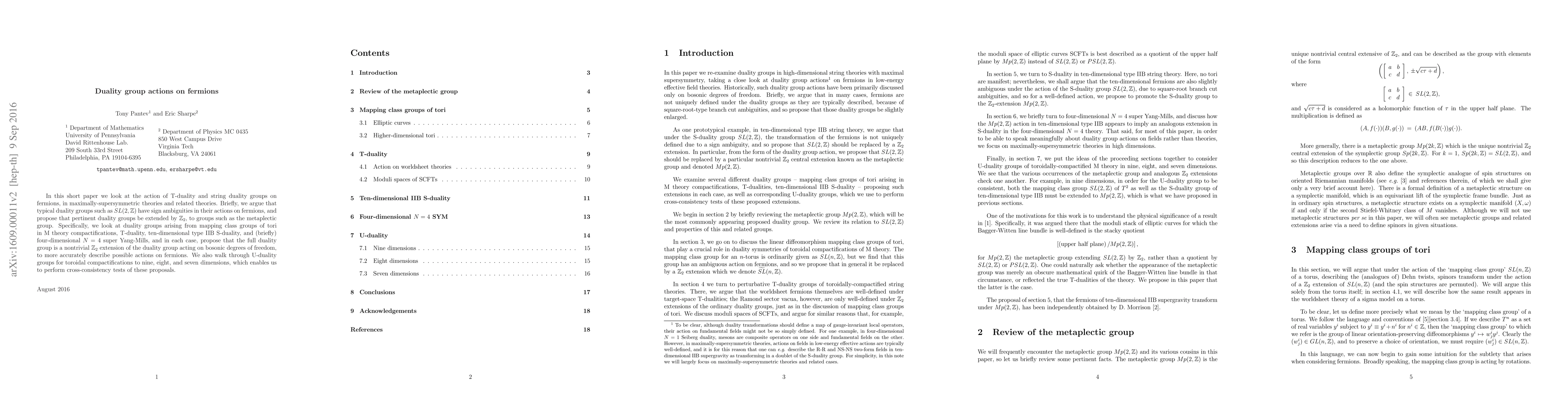 In this short paper we look at the action of T-duality and string duality groups on fermions, in maximally-supersymmetric theories and related theories. Briefly, we argue that typical duality groups such as SL(2,Z) have sign ambiguities in their actions on fermions, and propose that pertinent duality groups be extended by Z_2, to groups such as the metaplectic group. Specifically, we look at duality groups arising from mapping class groups of tori in M theory compactifications, T-duality, ten-dimensional type IIB S-duality, and (briefly) four-dimensional N=4 super Yang-Mills, and in each case, propose that the full duality group is a nontrivial Z_2 extension of the duality group acting on bosonic degrees of freedom, to more accurately describe possible actions on fermions. We also walk through U-duality groups for toroidal compactifications to nine, eight, and seven dimensions, which enables us to perform cross-consistency tests of these proposals.