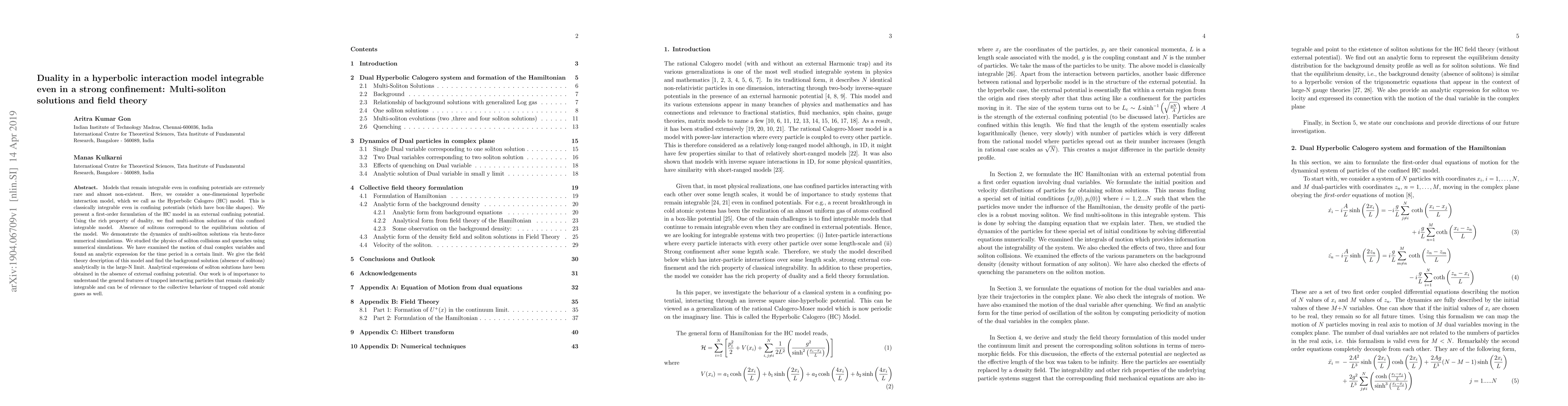 Models that remain integrable even in confining potentials are extremely rare and almost non-existent. Here, we consider a one-dimensional hyperbolic interaction model, which we call as the Hyperbolic Calogero (HC) model. This is classically integrable even in confining potentials (which have box-like shapes). We present a first-order formulation of the HC model in an external confining potential. Using the rich property of duality, we find multi-soliton solutions of this confined integrable model. Absence of solitons correspond to the equilibrium solution of the model. We demonstrate the dynamics of multi-soliton solutions via brute-force numerical simulations. We studied the physics of soliton collisions and quenches using numerical simulations. We have examined the motion of dual complex variables and found an analytic expression for the time period in a certain limit. We give the field theory description of this model and find the background solution (absence of solitons) analytically in the large-N limit. Analytical expressions of soliton solutions have been obtained in the absence of external confining potential. Our work is of importance to understand the general features of trapped interacting particles that remain classically integrable and can be of relevance to the collective behaviour of trapped cold atomic gases as well.