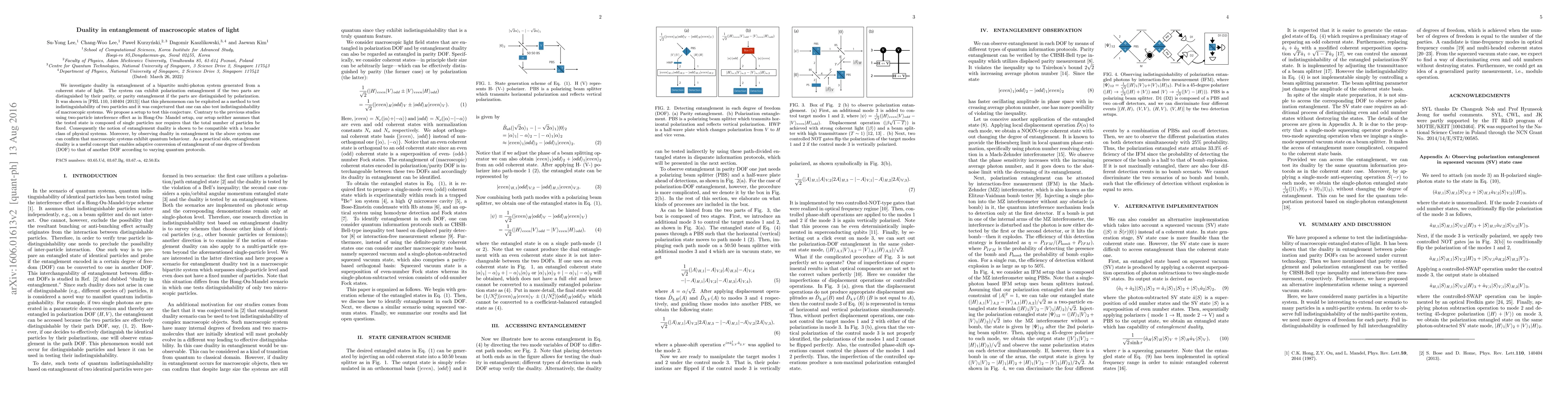 We investigate duality in entanglement of a bipartite multi-photon system generated from a coherent state of light. The system can exhibit polarization entanglement if the two parts are distinguished by their parity, or parity entanglement if the parts are distinguished by polarization. It was shown in [PRL 110, 140404 (2013)] that this phenomenon can be exploited as a method to test indistinguishability of two particles and it was conjectured that one can also test indistinguishability of macroscopic systems. We propose a setup to test this conjecture. Contrary to the previous studies using two-particle interference effect as in Hong-Ou- Mandel setup, our setup neither assumes that the tested state is composed of single particles nor requires that the total number of particles be fixed. Consequently the notion of entanglement duality is shown to be compatible with a broader class of physical systems. Moreover, by observing duality in entanglement in the above system one can confirm that macroscopic systems exhibit quantum behaviour. As a practical side, entanglement duality is a useful concept that enables adaptive conversion of entanglement of one degree of freedom (DOF) to that of another DOF according to varying quantum protocols.