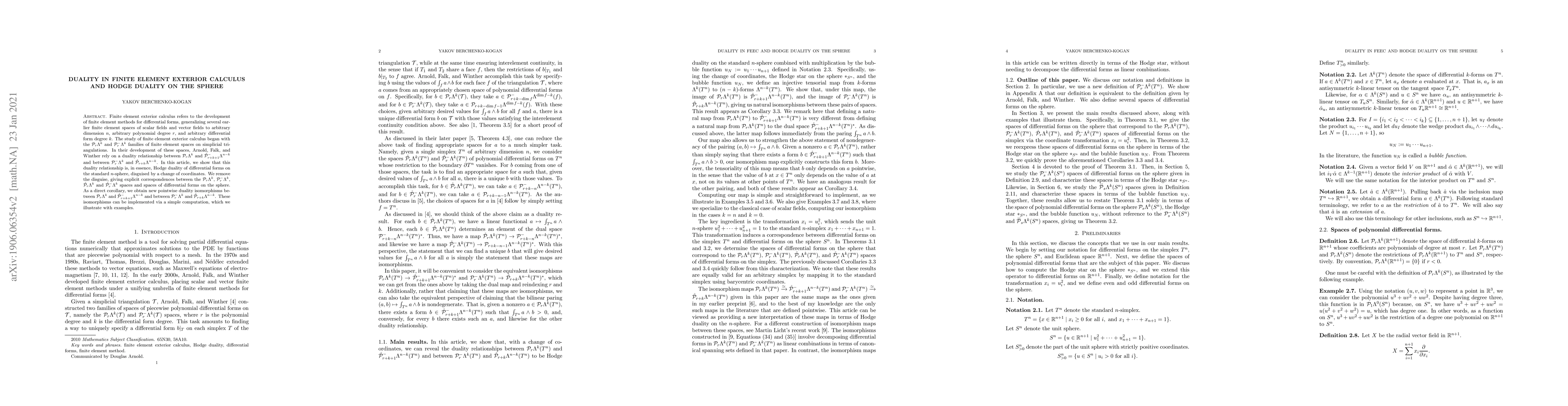Finite element exterior calculus refers to the development of finite element methods for differential forms, generalizing several earlier finite element spaces of scalar fields and vector fields to arbitrary dimension $n$, arbitrary polynomial degree $r$, and arbitrary differential form degree $k$. The study of finite element exterior calculus began with the $\mathcal P_r\Lambda^k$ and $\mathcal P_r^-\Lambda^k$ families of finite element spaces on simplicial triangulations. In their development of these spaces, Arnold, Falk, and Winther rely on a duality relationship between $\mathcal P_r\Lambda^k$ and $\mathring{\mathcal P}_{r+k+1}^-\Lambda^{n-k}$ and between $\mathcal P_r^-\Lambda^k$ and $\mathring{\mathcal P}_{r+k}\Lambda^{n-k}$. In this article, we show that this duality relationship is, in essence, Hodge duality of differential forms on the standard $n$-sphere, disguised by a change of coordinates. We remove the disguise, giving explicit correspondences between the $\mathcal P_r\Lambda^k$, $\mathcal P_r^-\Lambda^k$, $\mathring{\mathcal P}_r\Lambda^k$ and $\mathring{\mathcal P}_r^-\Lambda^k$ spaces and spaces of differential forms on the sphere. As a direct corollary, we obtain new pointwise duality isomorphisms between $\mathcal P_r\Lambda^k$ and $\mathring{\mathcal P}_{r+k+1}^-\Lambda^{n-k}$ and between $\mathcal P_r^-\Lambda^k$ and $\mathring{\mathcal P}_{r+k}\Lambda^{n-k}$, which we illustrate with examples.