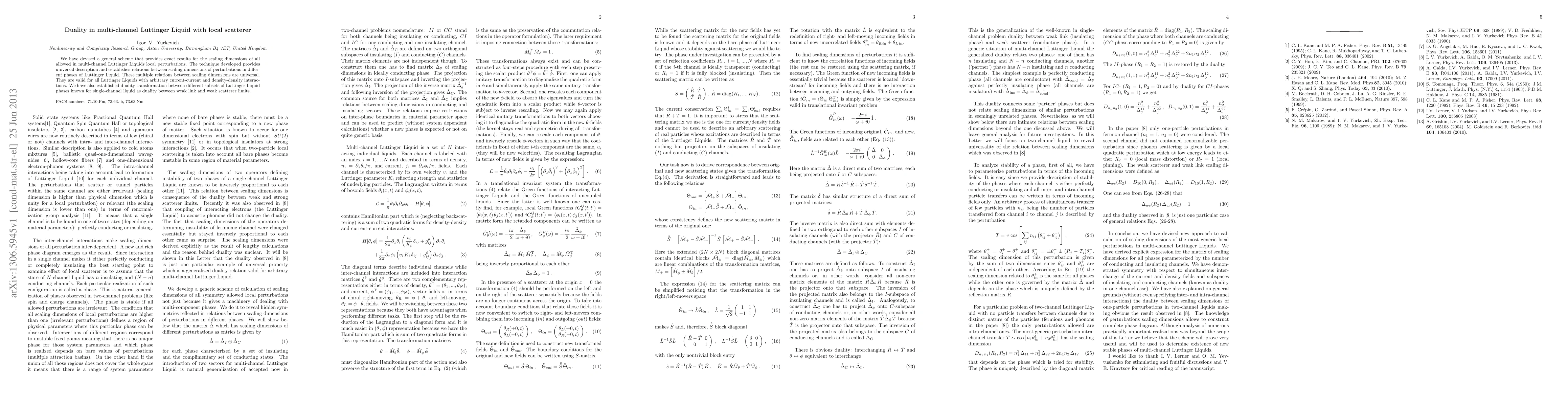 We have devised a general scheme that provides exact results for the scaling dimensions of all allowed in multi-channel Luttinger Liquids local perturbations. The technique developed provides universal description and establishes relations between scaling dimensions of perturbations in different phases of Luttinger Liquid. These multiple relations between scaling dimensions are universal. They are valid for all Luttinger Liquids with arbitrary current-current and density-density interactions. We have also established duality transformation between different subsets of Luttinger Liquid phases known for single-channel liquid as duality between weak link and weak scatterer limits.
