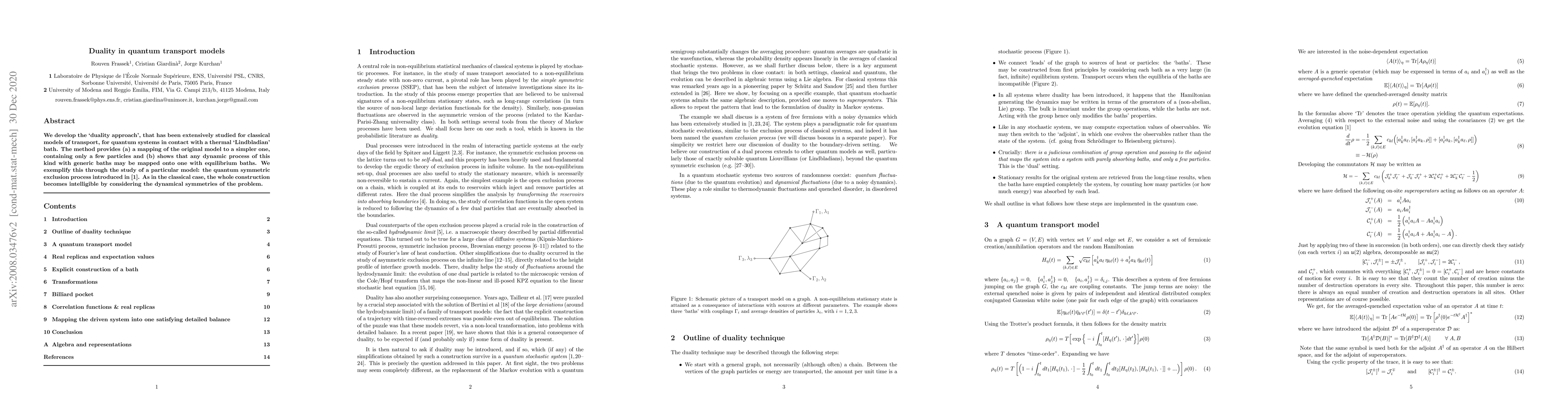 We develop the `duality approach', that has been extensively studied for classical models of transport, for quantum systems in contact with a thermal `Lindbladian' bath. The method provides (a) a mapping of the original model to a simpler one, containing only a few particles and (b) shows that any dynamic process of this kind with generic baths may be mapped onto one with equilibrium baths. We exemplify this through the study of a particular model: the quantum symmetric exclusion process introduced in [D. Bernard, T. Jin, Phys. Rev. Lett. 123, 080601 (2019)]. As in the classical case, the whole construction becomes intelligible by considering the dynamical symmetries of the problem.