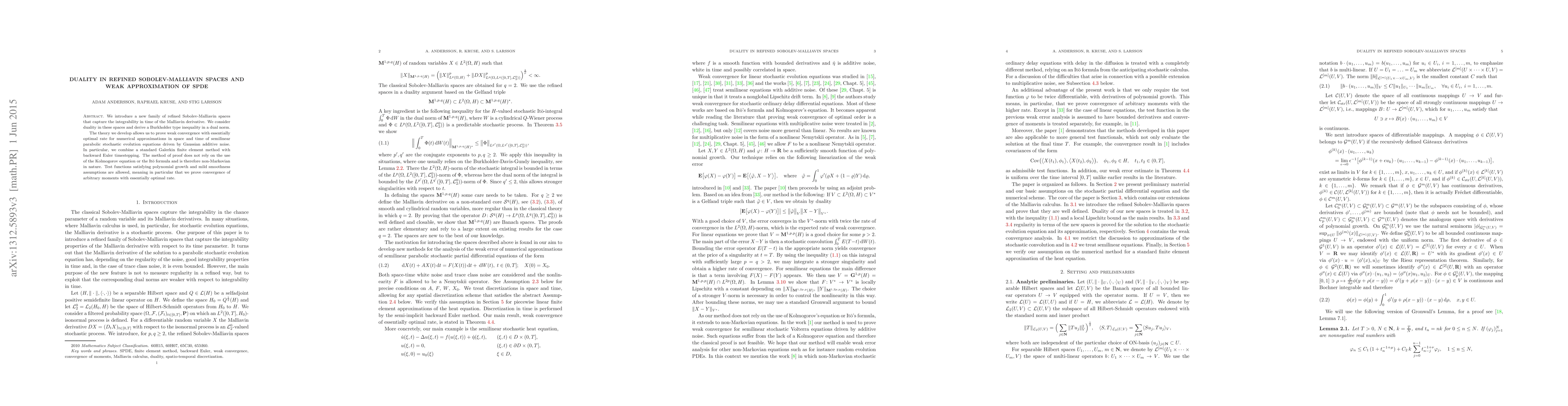 We introduce a new family of refined Sobolev-Malliavin spaces that capture the integrability in time of the Malliavin derivative. We consider duality in these spaces and derive a Burkholder type inequality in a dual norm. The theory we develop allows us to prove weak convergence with essentially optimal rate for numerical approximations in space and time of semilinear parabolic stochastic evolution equations driven by Gaussian additive noise. In particular, we combine a standard Galerkin finite element method with backward Euler timestepping. The method of proof does not rely on the use of the Kolmogorov equation or the It\={o} formula and is therefore non-Markovian in nature. Test functions satisfying polynomial growth and mild smoothness assumptions are allowed, meaning in particular that we prove convergence of arbitrary moments with essentially optimal rate.