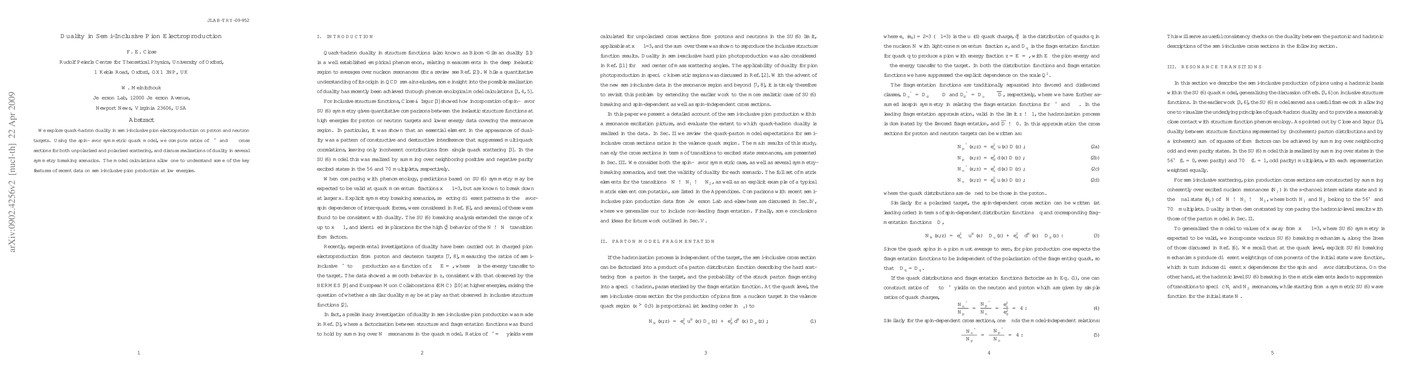 This paper investigates quark-hadron duality in semi-inclusive pion electroproduction, employing a spin-flavor symmetric quark model to compute pi+ and pi- cross-section ratios. It discusses how duality manifests in various symmetry breaking scenarios, providing insights into recent low-energy data.