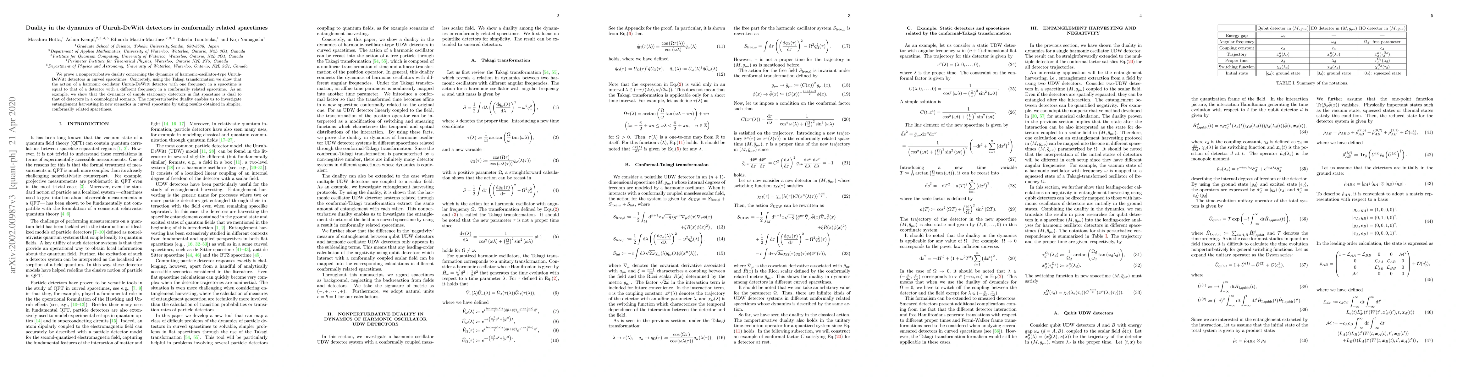 We prove a nonperturbative duality concerning the dynamics of harmonic-oscillator-type Unruh-DeWitt detectors in curved spacetimes. Concretely, using the Takagi transformation we show that the action of a harmonic oscillator Unruh-DeWitt detector with one frequency in a spacetime is equal to that of a detector with a different frequency in a conformally related spacetime. As an example, we show that the dynamics of simple stationary detectors in flat spacetime is dual to that of detectors in a cosmological scenario. The nonperturbative duality enables us to investigate entanglement harvesting in new scenarios in curved spacetime by using results obtained in simpler, conformally related spacetimes.