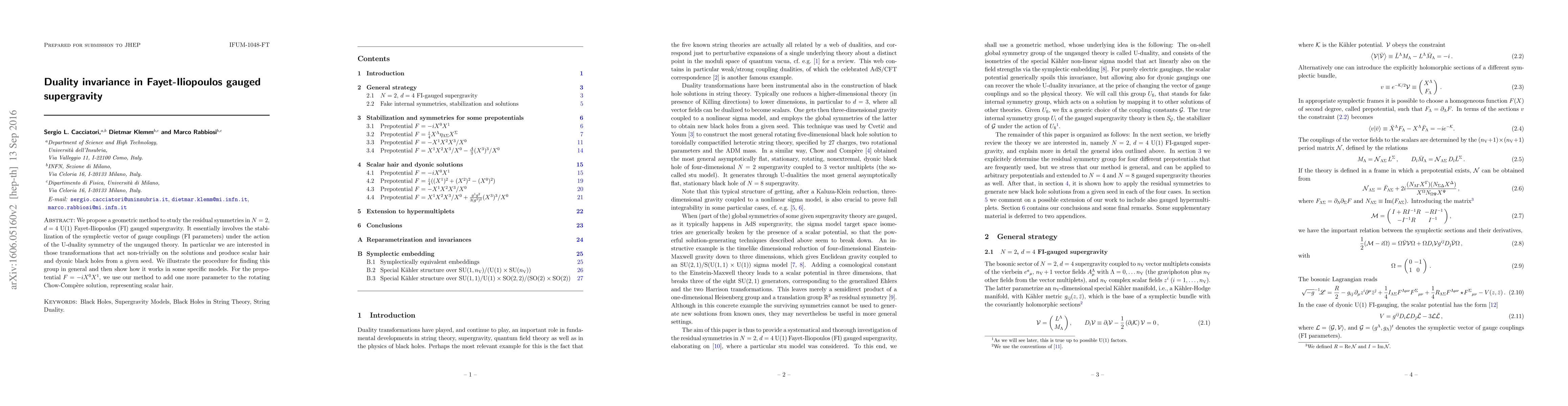 This paper proposes a geometric method to explore residual symmetries in $N=2$, $d=4$ $\text{U}(1)$ Fayet-Iliopoulos gauged supergravity, focusing on U-duality stabilization of gauge coupling vectors. It demonstrates how these symmetries can generate scalar hair and dyonic black holes, and applies the method to specific models, notably enhancing the rotating Chow-Compère solution with an additional scalar parameter.
